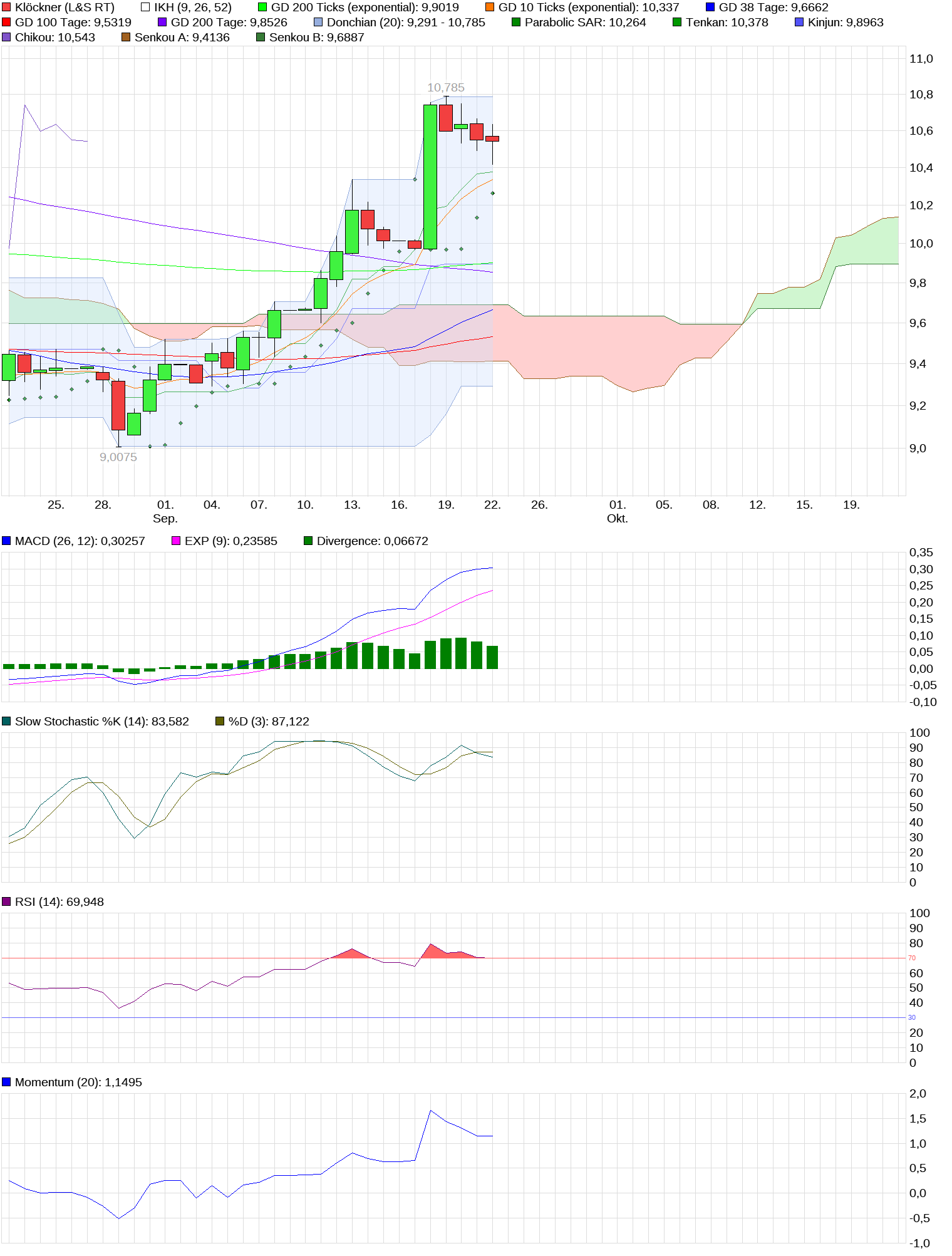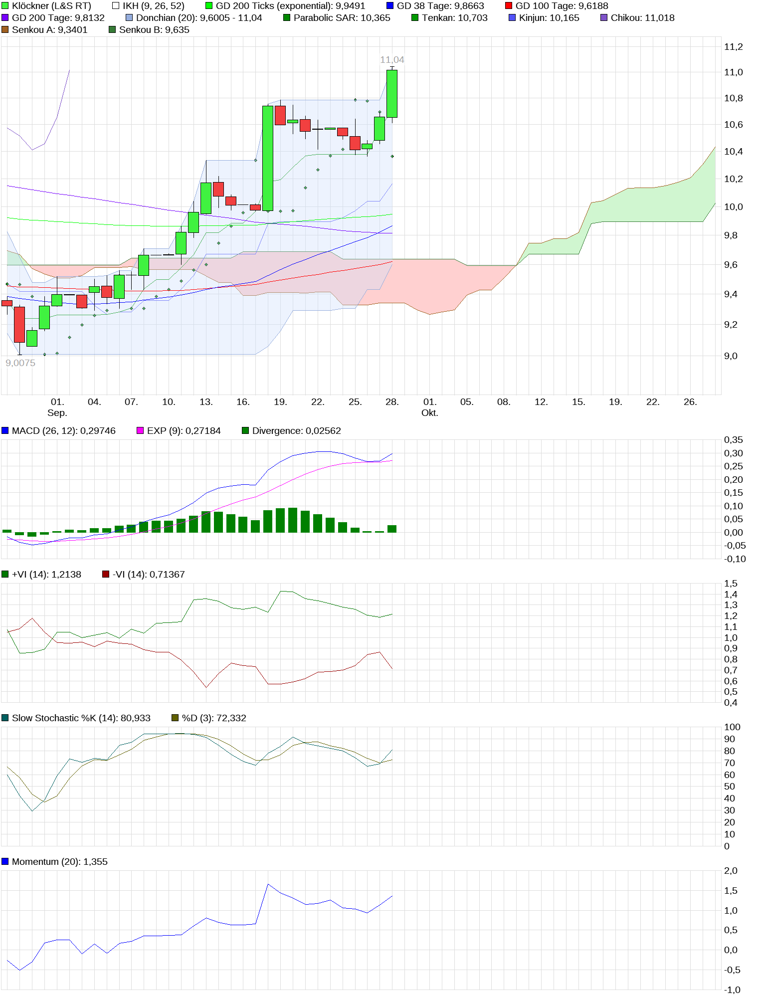 Ich gehe immer noch davon aus, daß die Trendwende zumindest eingeleitet wurde; die letzte Kursexplosion ist immer noch nicht verdaut worden, das deuten die 'Indikatoren' an, welche sich unisono immer noch im überkauften Bereich bewegen! Die müssen erst noch runter; das geschieht entweder durch einen Kurssturz oder es geschieht bei leicht stagnierenden Preisen mittels der Zeit! Zur Zeit haben wir immer noch eine klassische Aufwärtsflagge, und das läßt mich eben noch hoffen!