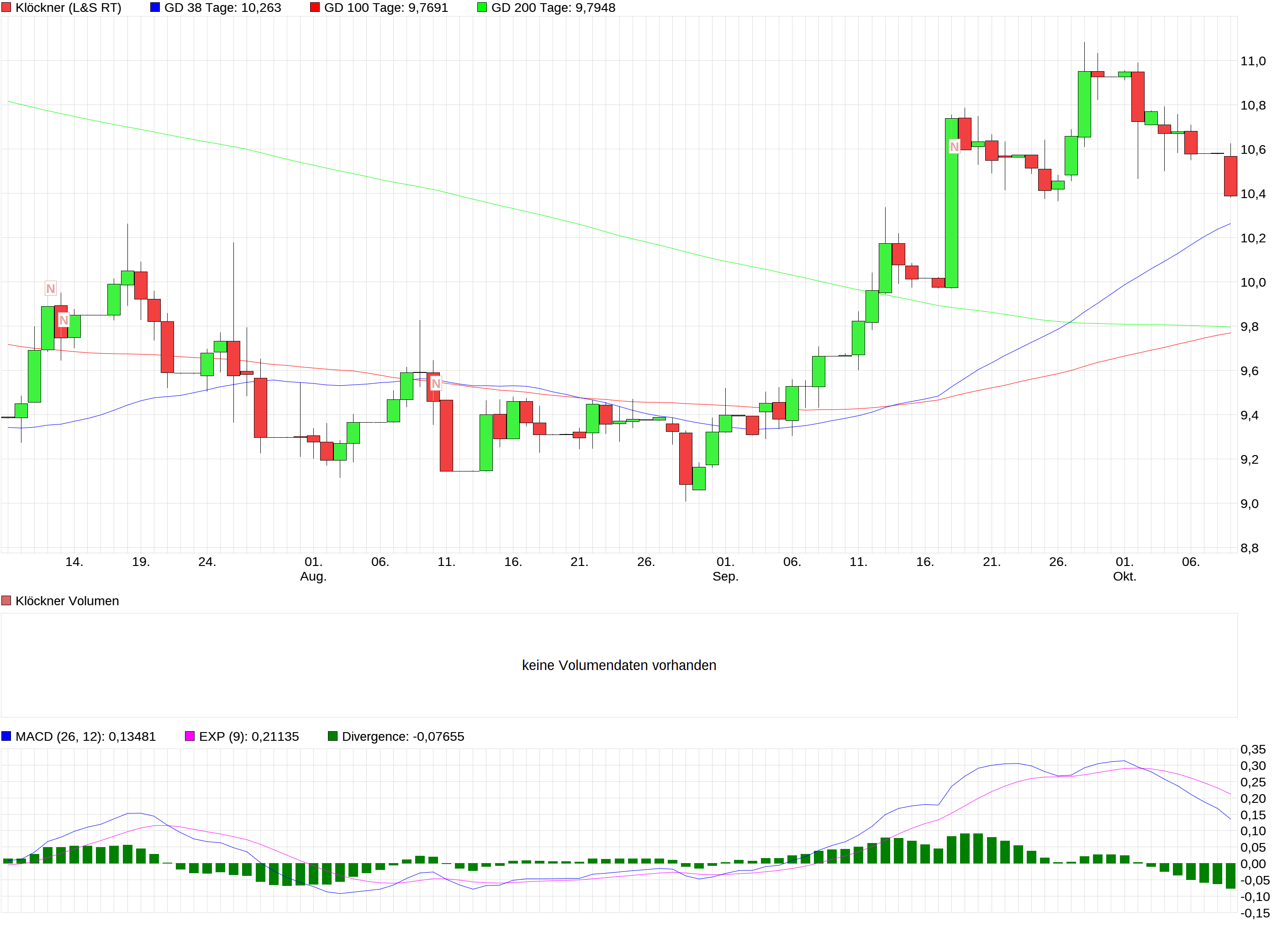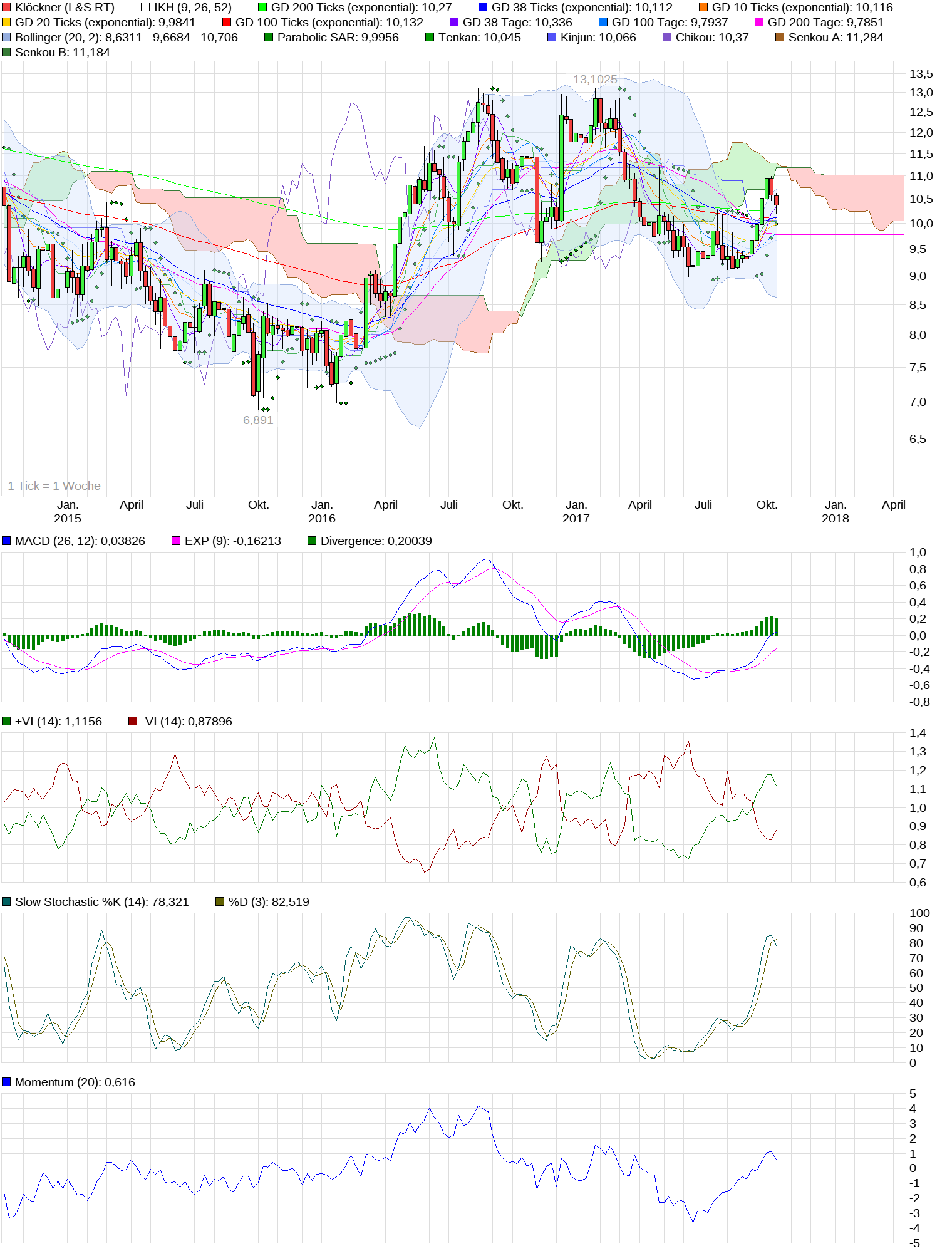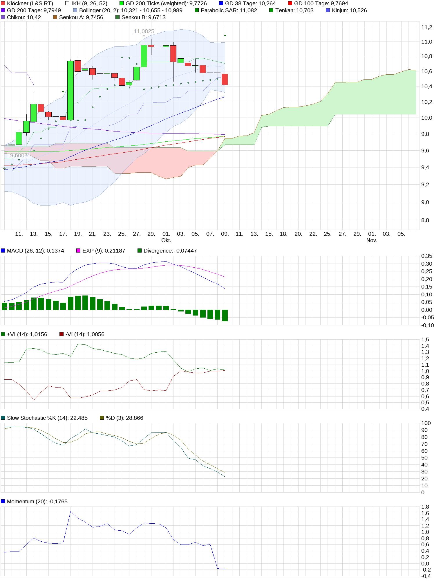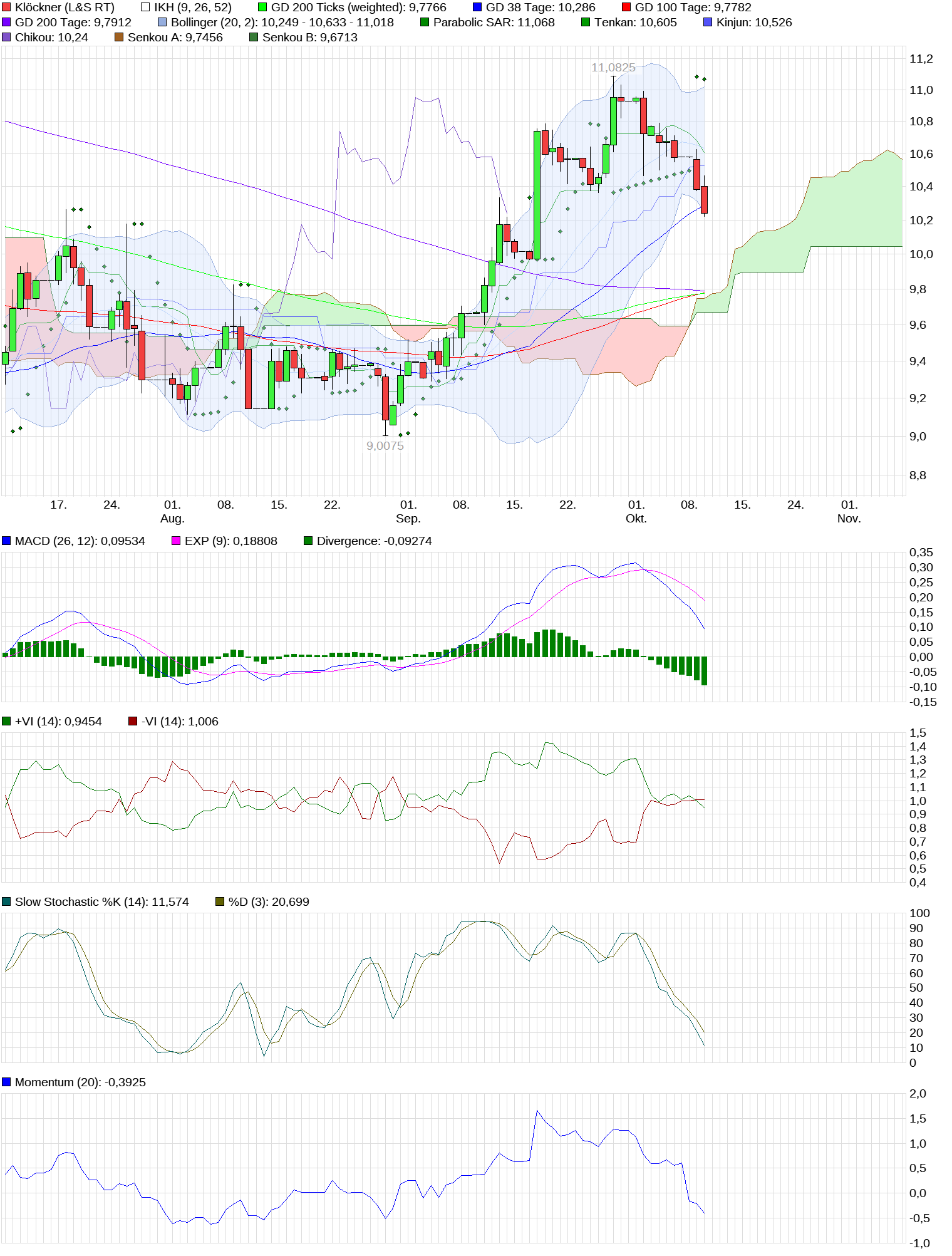 Dieser Bereich stellt nun den oberen Widerstand dar! Bin jetzt gespannt, ob die Unterstützung hält und der Kurs nach oben geht und zwar über die 11 €! Die Indikatoren zeigen noch nichts an, sie bewegen sich aber bereits im überverkauften Bereich!
