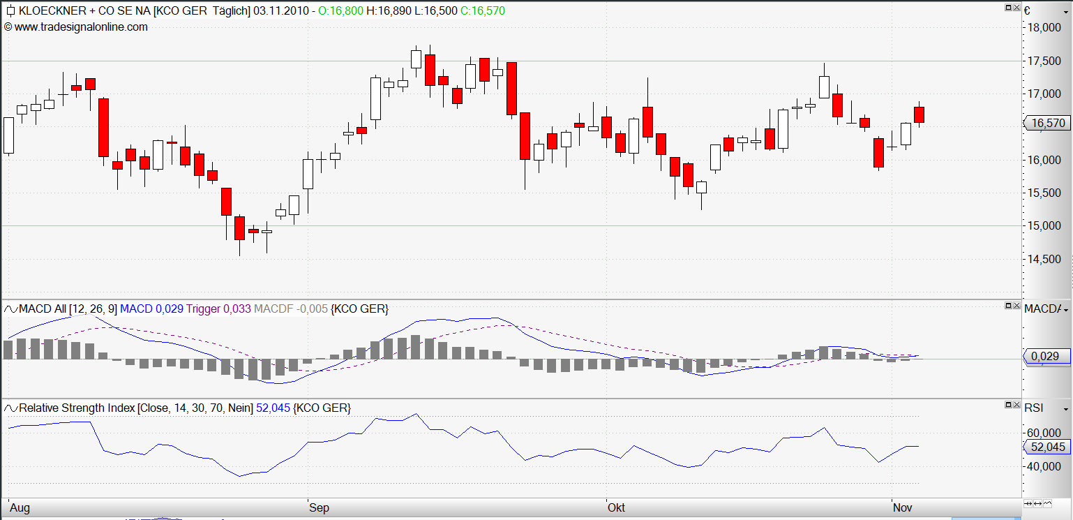 Hallo Klöckner-Fans, ich denke auch, dass wir ganz optimistisch in die nähere Zukunft schauen können. Mir ist natürlich auch aufgefallen, dass der Kurs am Nachmittag immer abflacht. Möglicherweise ist da doch jemand dabei, sich sukzessive von Beständen zu trennen. Nun, irgendwann läuft das aus und dann wird die niedrige Bewertung von Klöckner endlich voll durchschlagen. Ich rechnen in den nächsten Tagen mit einem Test der Marke von 17,50. Nach kurzer Verschnaufpause wird es dann Richtung 19/20 gehen. Das Umfeld ist einfach so positiv, dass sich ein solcher guter und moderat bewerteter Wert dem sich gar nicht entziehen kann bzw. wid. Immerhin gibt es ja zahlreise Analysten, die deutlich höhere Kurse prognostieren, d.h. über 20 Euro. Das wird irgendwann eintreten, das ist für mich keine Frage. Nur wann? Nun, ich denke Anfang des Jahres sobald die Ergebnisse für 2010 vorliegen. Es braucht auch nur die eine oder andere neue Akquisition angekündigt werden (dafür liegen ja zig Millionen bereit), dann dürfte das der Aktie zusätzliche Impulse verleihen. Also: dabeibeiben ist angesagt. Früher oder später zahlt sich das Engagement aus; freilich: man braucht etwas geduld. In diesem Sinne: Gefragt sind Ausdauer und Geduld, bis der Zeitpunkt gekommen ist.