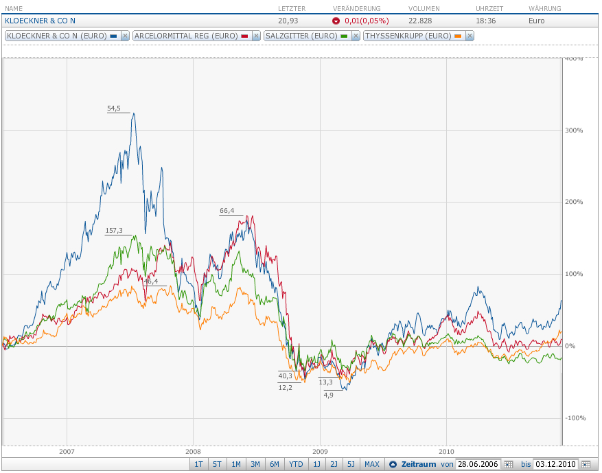 Die einzigen Hindernisse mit denen Klöckner als Stahl-HÄNDLER zu kämpfen hat sind doch nicht die Rohstoffpreise (Kohle, Erz, ...), sondern die Sparprogramme der Staaten - wird zumindest oft behauptet. Aber wie viel Umsatz macht Klöckner mit den Staaten, Ländern, Kommunen? Mir wollte das Klöckner-IR nie verraten. Gesagt wurde mir nur, dass das durchschnittliche Handelsvolumen bei 2.000 Euro pro Auftrag liegt. Da können also nicht nur Mega-Großprojekte dahinter stehen. Eher nach dem Motto: Kleinvieh macht auch Mist - also eher die kleinen Häuslebauer?!? Nach Aussage meiner Bank (eine ganz schön große Bank!) zieht die Nachfrage nach Krediten für privat Bauvorhaben jedenfalls derzeit drastisch an. Die haben alle Angst vor der Inflation und wollen bei den niedrigen Zinsen ihre Spargroschen in Betongold umschichten. Bis das beim Köckner durchschlägt dauert es vermutlich noch bis Mitte nächsten Jahres, aber dann....