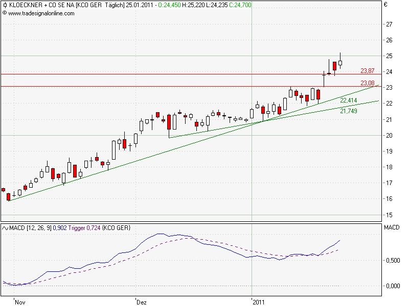 FRANKFURT (dpa-AFX Broker) - Die Commerzbank hat das Kursziel für Klöckner & Co (Profil) nach der Ankündigung eines Zukaufs von 28,00 auf 31,00 (Kurs: 23,245) Euro angehoben und die Einstufung auf "Buy" belassen. Die nicht unerwartete Akquisition des US-Unternehmens Macsteel könnte das Aktienergebnis des Stahl- und Metallhändlers KlöCo 2012 um geschätzte 0,60 Euro auf rund 3,15 Euro steigern, schrieb Analyst Ingo-Martin Schachel in einer Studie vom Donnerstag. Bereits 2011 könnte Macsteel laut seinen Berechnungen 1,1 Milliarden Euro Umsatz und 80 Millionen Euro Gewinn vor Zinsen, Steuern und Abschreibungen (EBITDA) pro Forma beitragen. Darüber hinaus könnten sich noch Synergien von etwa 10 Millionen Euro im weiteren Verlauf ergeben.