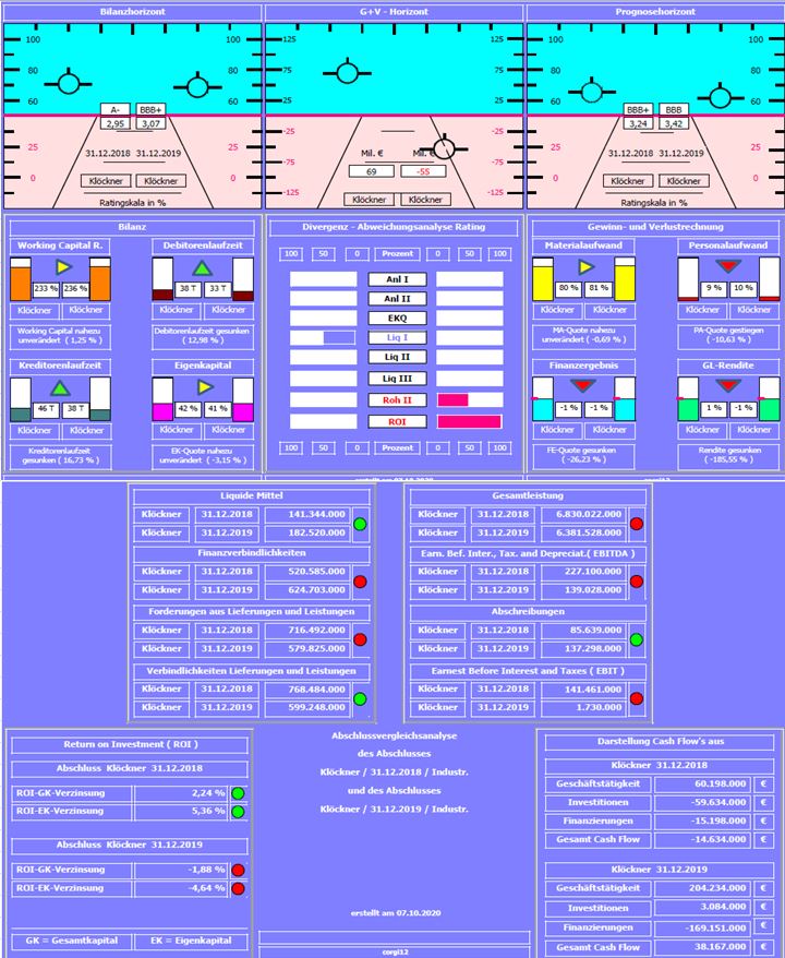 Negativ: Der Rohertrag II (Materialaufwand/Personalaufwand) hat unter der geringeren Gesamtleistung von ca. -450 Mil. Euro gelitten. Insbesondere der Personalaufwand konnte nicht an den Umsatzrückgang angepasst werden. Aus dem ausgewiesenen Jahresfehlbetrag resultiert die Verschlechterung des Return on Investment (ROI).
