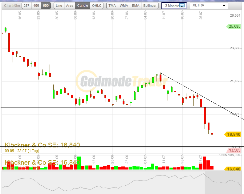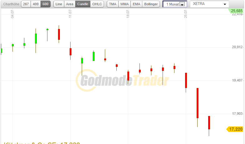 Habe Klöckner für 20,20 gekauft, heute steht sie bei 17. Macht 15% Prozent Verlust. Finde ich ganz normal für eine Aktie, normal rechnet man mit einer Volatilität von ca. 30%. Ich würde nur verkaufen, wenn es schlechte Nachrichten gäbe. Wer mit der Volatilität von Aktien nicht gut leben kann, den versteh ich gut, aber dann sollte er sein Geld auf ein Tagesgeldkonto legen. Dieses Geld ist aber auch futsch, wenn die entsprechende Bank pleite macht.