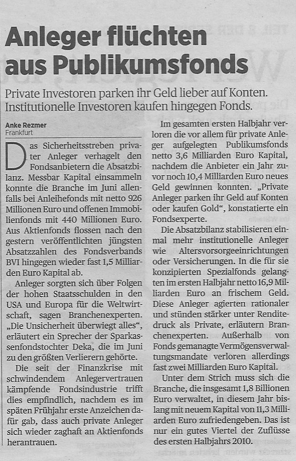 Dem heutigen Bericht des Handelsblattes zu folgen könnten die darin beschriebenen Mittelabflüsse u.a. verantwortlich sein für die irren Verkäufe der letzten Tage. Wenn die Privatanleger Angst vor dem Scheitern der US-Verhandlungen wegen der Schuldengrenze hatten und ihre Fonds aufgelöst haben (ich keine da einen aus meinem privaten Umfeld), dann verkaufen die Fonds (müssen verkaufen) auf teufel komm raus und ohne Rücksicht auf die erreichten Ergebnisse. Dazu braucht es dann gar keine Unternehmenszahlen und wie man gestern gesehen hat sind dann alle davon betroffen. Bis die Fonds liquidieren dauert es - nach dem Verkaufsauftrag des Kunden - oft noch ein paar Tage, was dazu führt, dass die Panikwelle noch ein paar Tage nachlauf hat. Da durch die ausgelöste Verkaufsflut auch noch die ein oder andere Barriere/Widerstandsline/.... gebrochen wird laufen dann zu allem Überfluss auch noch die PC's an und tun ihr Übriges.