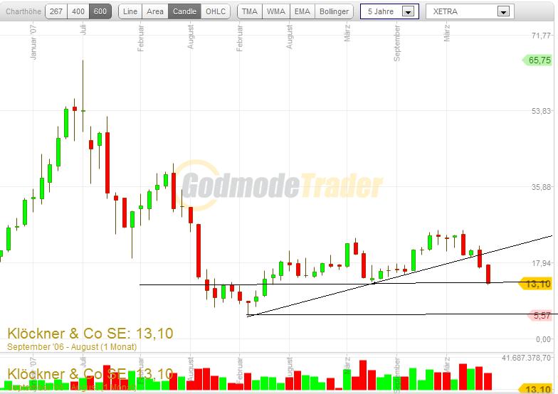 Michael Shillaker, Analyst der Credit Suisse, reduzierte seine Gewinnschätzungen für Klöckner & Co aufgrund des Preisrückgangs bei Stahlprodukten im zweiten und dritten Quartal. Den Verwässerungseffekt durch die Ausgabe neuer Aktien hat er in sein Kursziel schon eingerechnet. So kommt er zu dem Rating für die Aktie mit "Outperform" und seinem ebenfalls bestätigten Kursziel von 26 Euro. Insgesamt haben die Analysten ihre Schätzungen für den Gewinn je Anteilschein für die Jahre 2011 bis 2013 deutlich gesenkt. Sie erwarten nun Ergebnisse von 1,61 Euro beziehungsweise 2,05 Euro respektive 2,34 Euro. Das entspräche Kurs-Gewinn-Vielfachen von 8 beziehungsweise 6 respektive 5. Solange sich die weltweiten Aktienmärkte nicht nachhaltig beruhigt haben, sollten Anleger allerdings ein Engagement noch abwarten.