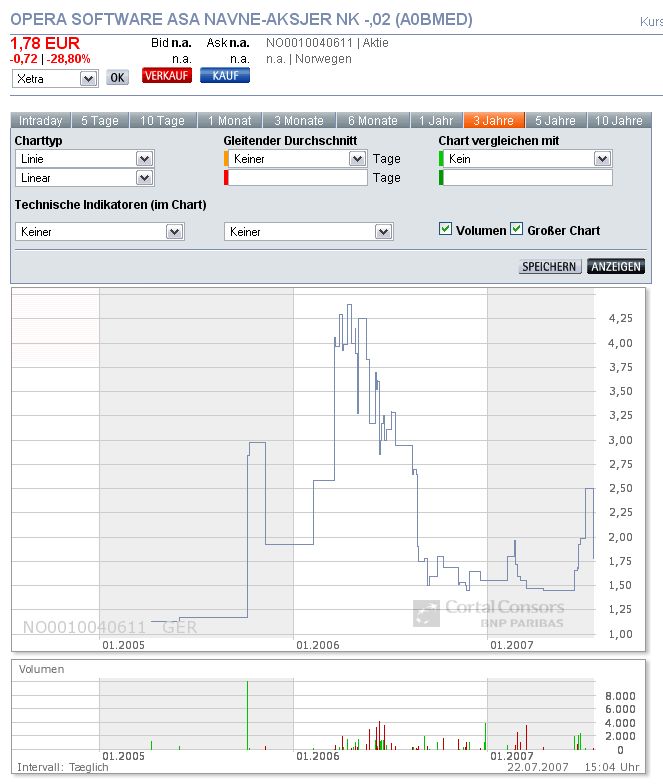 Ich würde die Aktie nicht kaufen. Opera ist ein Internetbrowser, der ein Nischendasein führt zwischen den hochprofessionellen GRATIS-Browsern von Microsoft (Internet Explorer 7) und Mozilla (Firefox 2, Mozilla, Seamonkey). Die PC-basierten Browser von Opera sind ebenfalls Freeware, womit kein Geld verdient wird. Kostenpflichtig sind lediglich die Opera-Browser für den Handybereich - der noch recht jung ist. Kommen da erst mal Stückzahlen auf, lassen Gratis-Versionen von Mozilla und Microsoft (die ja auch ein Handy-Betriebssystem anbieten) nicht lange auf sich warten.