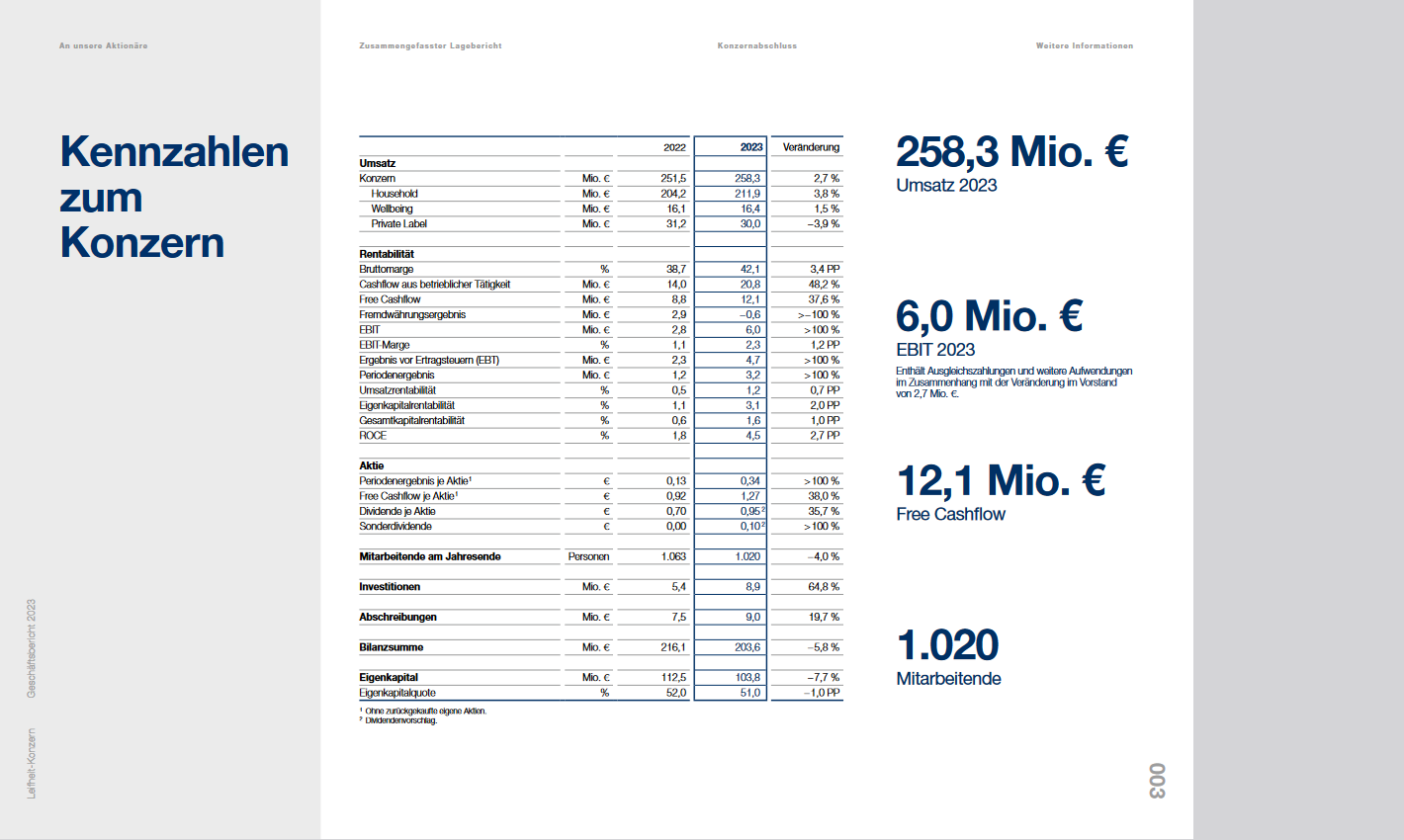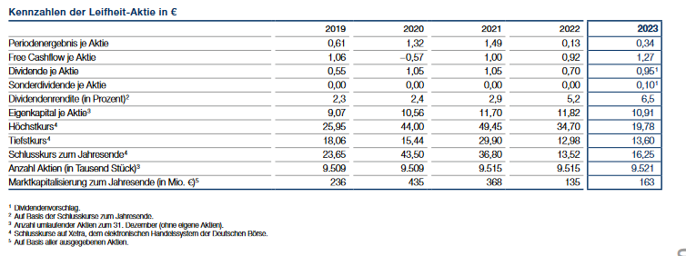 Die Prognose für das Konzernergebnis vor Zinsen und Steuern, kurz EBIT, wurde ebenfalls angepasst. Statt eines EBITs im unteren einstelligen Millionenbereich wird nun ein Wert im mittleren einstelligen Millionenbereich erwartet, damit wohl auch eine Steigerung gegenüber den 2,8 Millionen Euro aus dem Jahr 2022. Entsprechend der neuen Leifheit-Prognose solle der Free Cashflow voraussichtlich im oberen einstelligen Millionenbereich liegen, gegenüber einer früheren Prognose im unteren Millionenbereich und den 8,8 Millionen Euro aus dem Jahr 2022....":