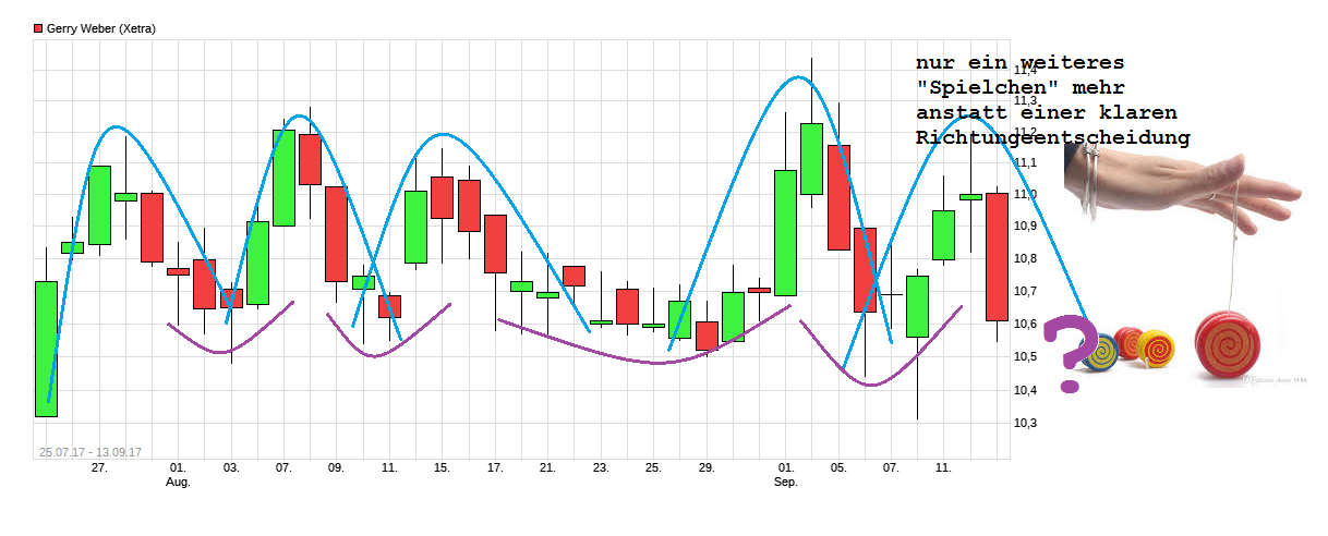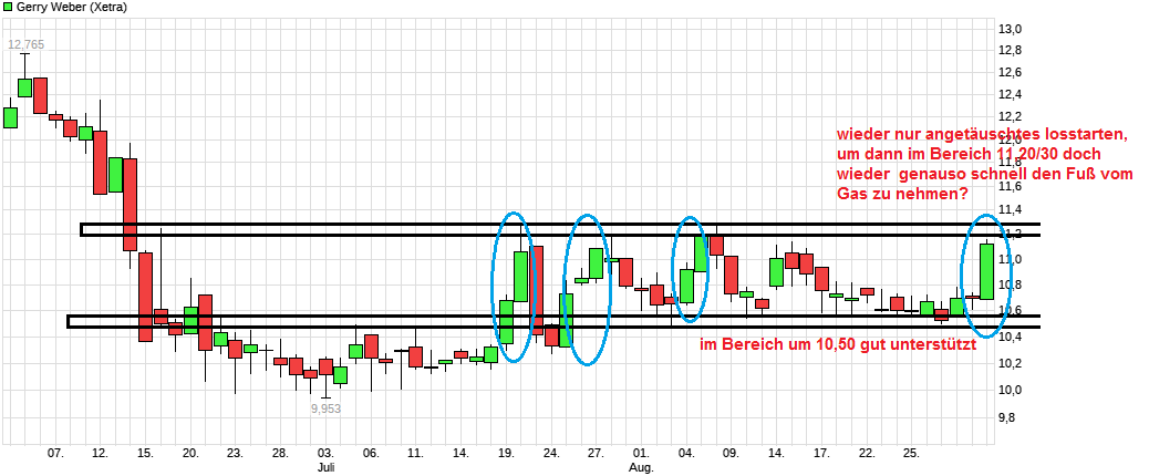 in der Seitwärtsrange, wie man es in den letzten Wochen schon öfters sehen konnte, oder kommt doch irgendwann mal genug Schwung auf, um die Region 11,20/30 nach oben NACHHALTIG rauszunehmen? Habe manchmal das Gefühl, daß hier vielleicht ein Leerverkäufer scheibchenweise Eindeckungen vornimmt, dann aber tunlichst vermeidet über die Grenze der Seitwärtsrange zu laufen, um kein Kaufsignal zu erzeugen und damit sich weiter eindeckungen selber teuerer zu machen. Na, ich laß mich mal überraschen was daraus wird und ob es Anschlußkäufe gibt. Echte News sind eher Mangelware. Zumindest scheint auf der Unterseite die Region um 10,50 erstmal relativ stabil zu sein. Irgendwann muß man sich mal entscheiden, ob man 11,30+x will oder nochmal 10,50-x