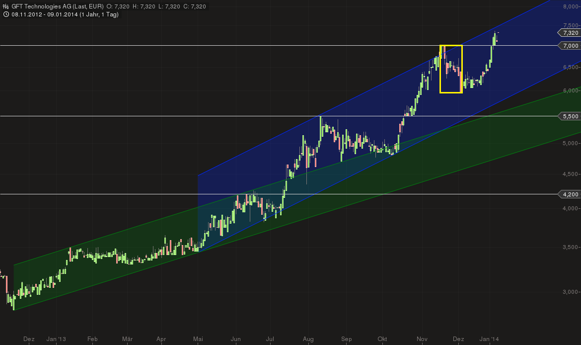 Auf GFT bezogen, dürfte die Oberkante des bei mir blauen Trendkanals zunächst kurzfristig die oberen Ziele bestimmen und nach und nach dann an ca. 8,00 - 8,10 EUR laufen.