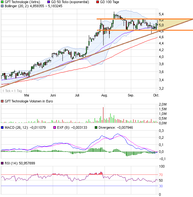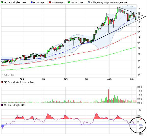 Die SKS ist erstens im kurzfristigen Bild nicht genau genug, und zweitens sollte man den übergeordneten Chart immer im Blick haben, denn die längerfristige Betrachtung ist chartanalytisch immer wichtiger. Und da sehen wir bei GFT den Bruch des Widerstands von 4,6-4,8 € vor einigen Wochen. Darüber kann man durchaus ein paar Wochen oder gar Monate konsolidieren, aber grundsätzlich muss man davon ausgehen, dass dieser ehemalige Widerstand jetzt zur Unterstützungszone wird und auch hält.