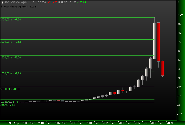 Bei aller Sympathie gegenüber der Firma und Aktie K+S sollte man folgendes beachten: K+S ist Mono-Produzent und profitiert allein vom starken Anstieg des Kalipreises (Monsanto hat eine breitere Aufstellung mit Saatgut und Gentechnik). Der Kalipreis wird aber nicht unendlich weiter explodieren (s. Öl oder andere Rohstoffe). Ein relativ hohes Niveau wird wohl bleiben, d.h. daß das Gewinn-Niveau der Firma ebenfalls stabil bleibt, aber nicht wesentlich steigerungsfähig ist. Das wiederum heißt, daß die Spitzenkurse bei sämtlichen Kali-Aktien (auch Yara + Potash) überzogen waren. Die Kurse vom Sommer werden wir nicht mehr sehen. Tradingchancen sehe ich für die nächste Zeit zwischen 35 und 60 Euro.