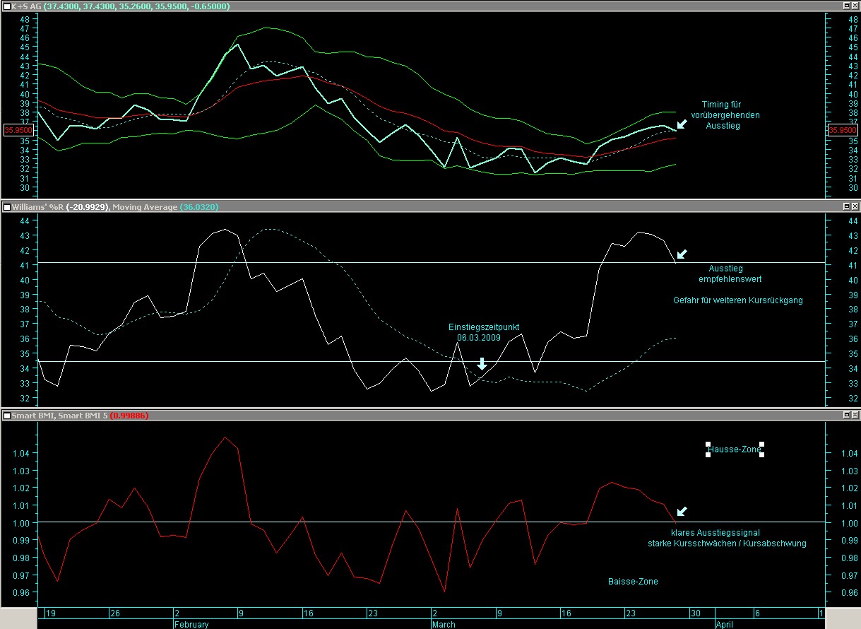 Meiner Meinung nach sollte diese positive Stimmung bei K+S ausgenutzt werden, um Aktien (nach und nach) zu verkaufen, bzw. sich Short einzudecken. Unter den Fachleuten herrscht die Meinung, dass wir uns gerade in einer Bäenmarktrally bewegen. Die umgekehrte Richtung kann ohne große Vorwarnung mit großen Schritten eingeläutet werden. K+S wird dann parallel zu DAX und Co. in Richtung Süden gehen!