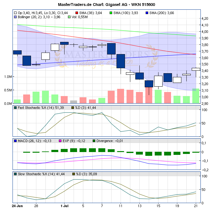 Der Kurs steigt und die 38 Tageslinie kommt uns freundlicherweise jeden Tag ein Stück näher.. Der Macd steht unmittelbar vor dem Kaufsignal (Macd Divergence aktuell bei -0,01, gestern bei -0,02. Die heutige (bullische) Kerze wieder mit einem deutlich höheren Schlusskurs als gestern, passt ins Bild der am 16.07.2011 gebildeten Trendumkehr-Kerze (bullischer Candlestick-Hammer). Seit dem bildet die Aktie einen kurzfristigen Aufwärtstrend aus. Als erstes muss nun die 3,50 Euro Marke überwunden werden. Passiert dies, hätten wir unser Kaufsignal, dann würden auch die 38/200 Tageslinien schnell zurückerobert werden mit Zielmarke 3,80 Euro. Ebenso dürfte dann das Momentum stark ansteigen.Ampel steht nach wie vor auf grün. Morgen könnte der Macd das Kaufsignal liefern, es fehlt nicht mehr viel. Slow+Fast Stochastic haben ja bereits seit längerem bullisch gekreut. Die RSI aktuell bei 44,91 hat noch genügend Luft nach oben.