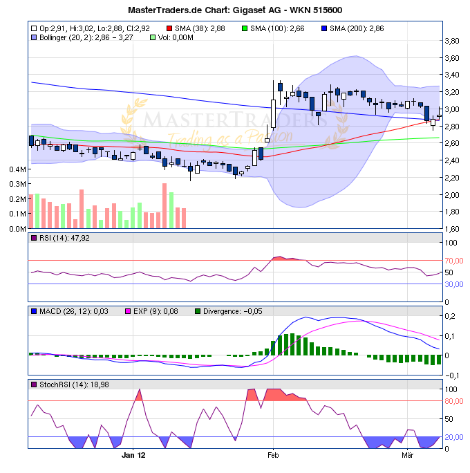..... Wir haben Sie zuletzt immer wieder darauf hingewiesen, dass Gigaset nochmals unter 3 Euro fallen würde. Die Unterstützung bei 2,80 Euro konnte vorerst gehalten werden. Sollte nochmals eine Marktkorrektur einsetzen wird es auch schwer werden die 2,80 Euro zu halten. Von daher bleibt Gigaset noch eine Halteposition. Mit einem Neukauf würden wir noch abwarten.