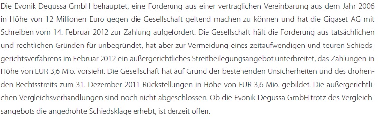 Im Anhang ein Ausschnitt aus dem Jahresabschluss 2011. Das Vergleichsangebot mit 3,6 Mio Euro hat Evonik wohl erstmal abgelehnt wie es aussieht. Die werden aber andersrum wohl auch kaum 12 Mio bekommen. Am Ende werdens wohl 5-10 Mio.