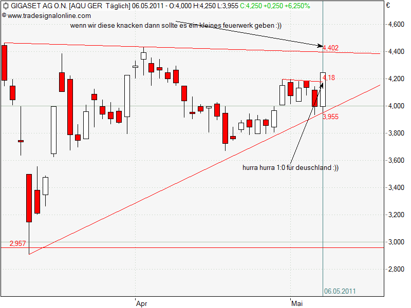 Sollte Gigaset allerdings signifikant unter 3,50 Euro zurückfallen, kann eine Abwärtskorrektur bis ca. 2,79 - 3,06 Euro folgen. Erst unterhalb des Unterstützungsbereichs bei 2,20 - 2,35 Euro wird es mittelfristig kritisch.