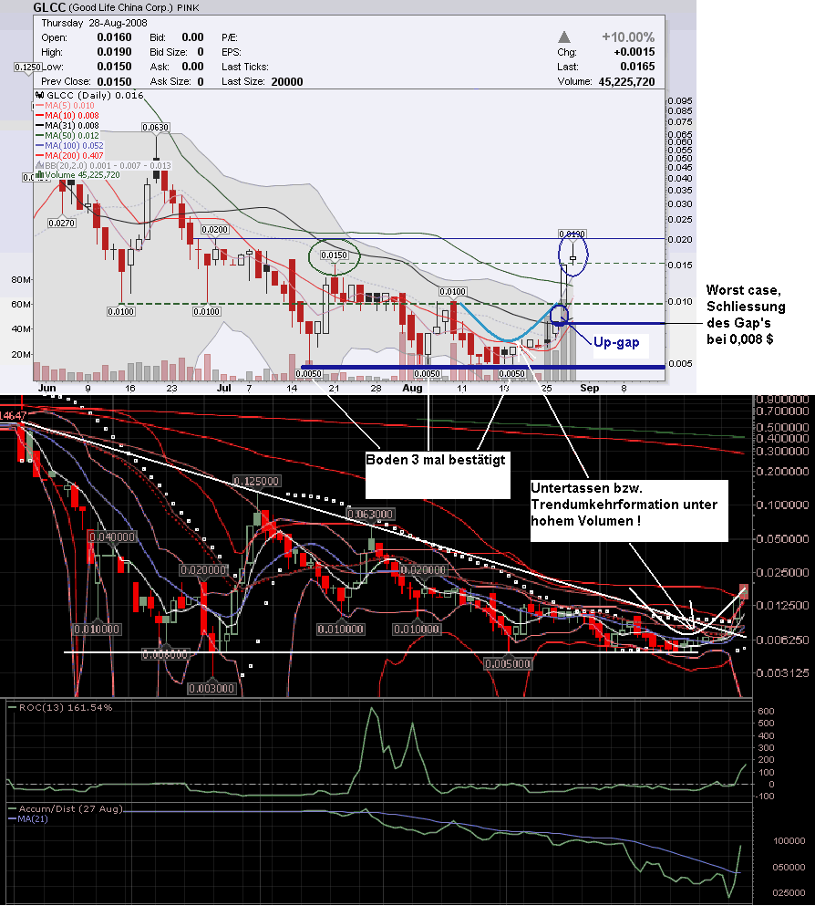 sorry, daß ich mich hier einmische... bin zwar nicht (mehr) hier investiert, aber kenne ganz genau den Handelverlauf in den USA bei der und auch anderen Pennys... Es muß nicht so laufen, aber oft... und schätze auch Heute wird es hier höher anfangen (ca. 0,015- 0,017$) und erst nach oben laufen... dann aber (ca 1/2 Std) dreht der Kurs nach unten - lässt Euch nicht unter Panikverkäufen beeinflussen... Nach 2-3 Std. ist der Kurs oft am Vortagnevau und bleibt so bis 1 Std. vor Börsenschluß so... erst kurz vor Schluß (so wie Gestern) steigt der Kurs wieder... Natürlich, kann sein daß der Kurs gleich explodiert und stark nach oben geht... dann aber Limite (im Kopf) setzen und entscheiden... nicht zu viel verlangen!... besser 50% sicher, als 400% versprochene..,
