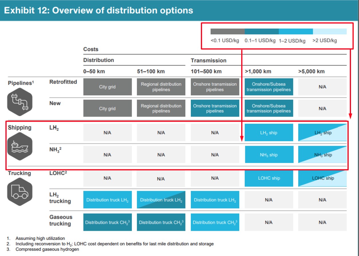 Die Kapital- und Betriebskosten aus diesen Schätzungen wurden dann mit den gleichen Kosten für den Transport von verflüssigtem Wasserstoff und Ammoniak (das in Wasserstoff umgewandelt werden kann) verglichen.