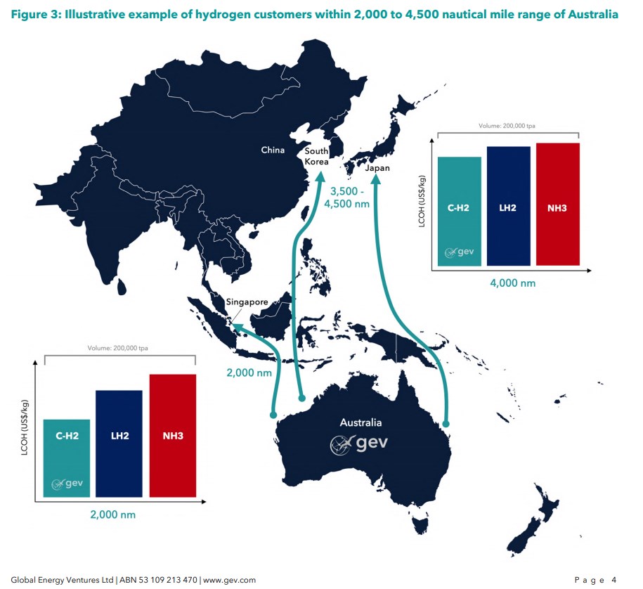 Die Strategie von Global Energy Ventures ist es, den Wasserstoff aus australischen Quellen in internationale Märkte im Bereich von 4.000 bis 4.500 Seemeilen zu exportieren - hauptsächlich nach Südostasien.
