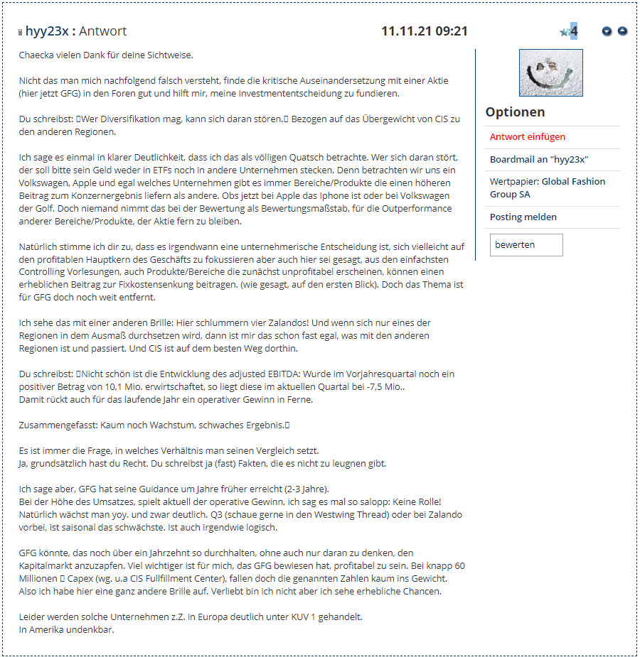 Aufgrund der weiteren Verbesserungen wird es nochmal wahrscheinlicher, dass GFG den Turnaround schafft. Das CRV ist aus den genannten Gründen attraktiv. Ich hoffe sehr, dass die genannten Aspekte und deren Reflexion dabei helfen können, sich ein besseres Bild der aktuellen Situation zu machen. Ein ausschließlicher Fokus auf Zahlen und Chart ist hier genau so wenig zielführend wie ein ausschließlicher Fokus auf Laborwerte und Diagramme in der Medizin. Ein ganzheitlicher Blick ist die richtige Herangehensweise. Keine Handlungsempfehlung. Angaben wie schon oben erwähnt ohne Gewähr.