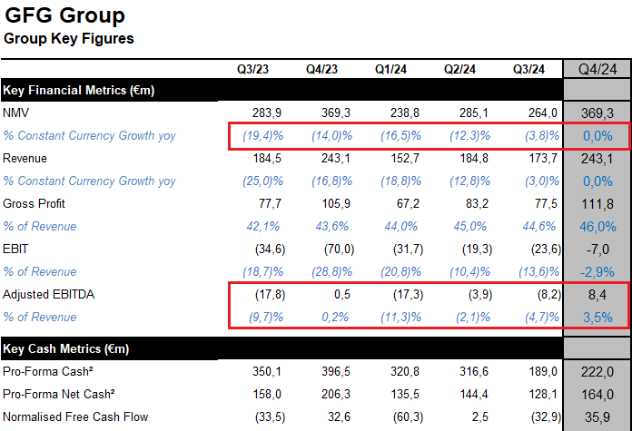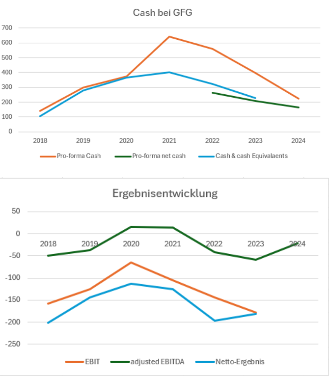 rechne ich jetzt mit einem Anstieg des NVM von 5% und einem Break even beim EBITDA. Cashburn wäre dann im Bereich von 40 Mill. Wenn man die letzte Anleihe zurückkaufen kann und noch einen Nettocasheffekt von 10 Mill. erzielt, dann würde GFG mit rd. 130 Mill. Nettocash das Jahr 2025 abschließen. Ich hoffe aber, dass es im Verlauf des Jahres 2025 zu einer Transaktion kommen wird, nachdem der Umsatzverlust ausgebremst wurde und sich die Risiken für etwaige Erwerber entsprechend reduziert haben.