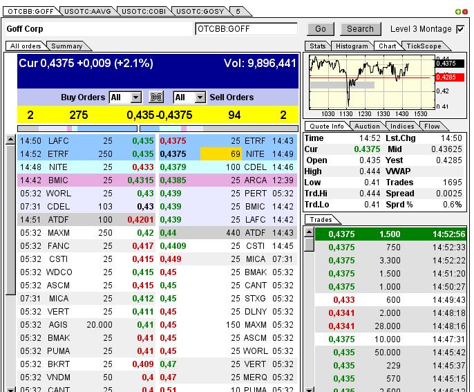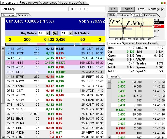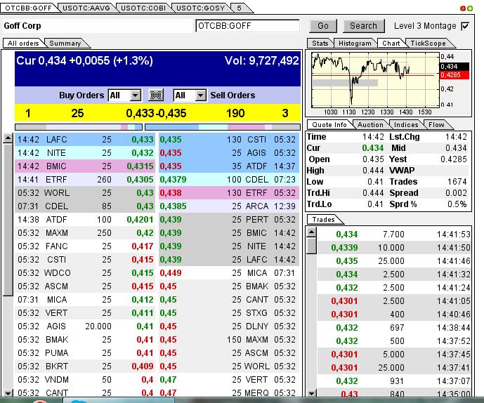 If you looked at the market today, shorts came in again and tried to bring the stock below 41 cents. However, heavy investors were bidding in the tune of 2 million shares in that area and their attempt failed yet again. Share price in GOFF quickly bounced back to 43 cents and are showing no sign of slowing down.