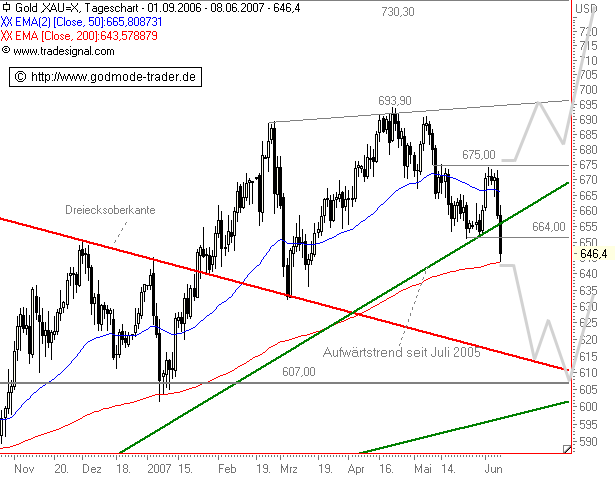 Rückblick: GOLD markierte nach einer steilen Kursrallye im Mai 2006 ein Mehrjahreshoch bei 730,30 $ und startete eine Korrekturbewegung. Diese verlief volatil seitwärts, wobei das Edelmetall in den vergangenen Monaten wieder nach oben tendierte. Nach einem Jahreshoch bei 693,90 $ im April korrigierte GOLD zurück in den Bereich des Aufwärtstrends seit Juli 2005 (lineare Darstellung!) und dem EMA200 auf Tagesbasis bei 644,00 - 650,00 $, wo es sich stabilisierte und wieder nach oben drehte. Mit dem Anstieg über 675,00 $  vergangene Woche ist das Edelmetall nun wieder deutlich erstarkt. Das kurz- und mittelfristige Bild bullisch zu werten.