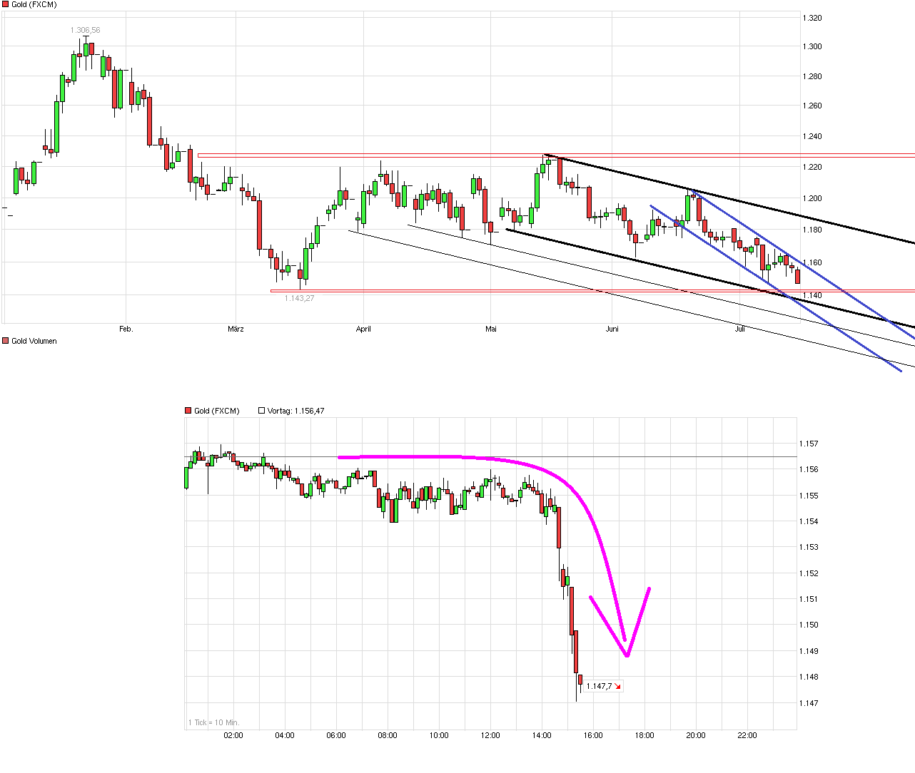 Nur so ein Gefühl...kurzfristig jetzt ein Test der 1150$...dann kurzer Kissback an die 1182$...dann endgültig abwärts...