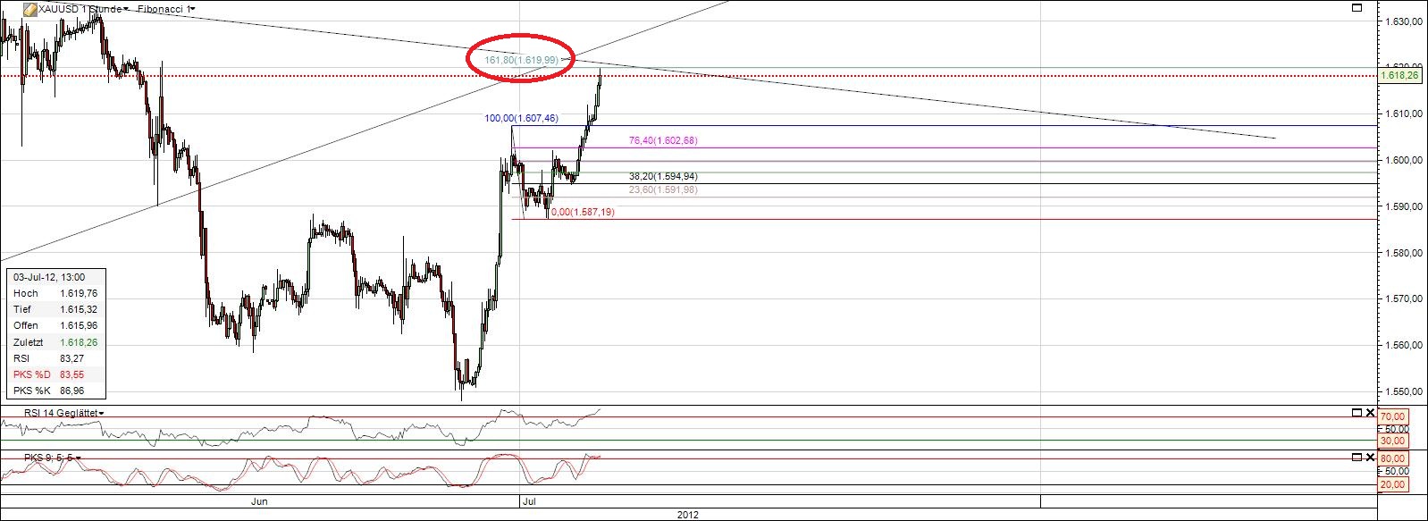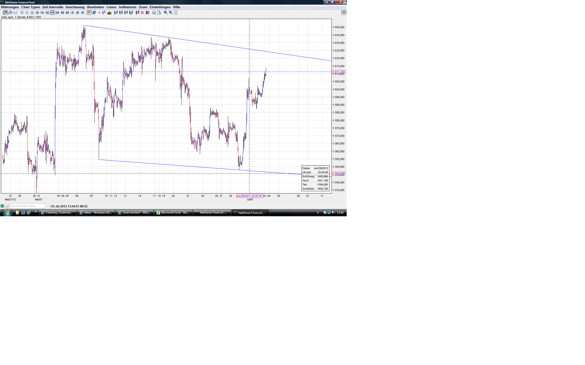 12:40 Uhr: "Mindestens auf 1570 warten" – das würde ich nicht mehr unterschreiben wollen. Sie mögen zwar noch kommen, aber nicht unbedingt "mindestens". Der Impuls begann bei 1548 und lief bis 1607. Die Welle 1 war bei 1557 und die Welle 4 zwischen 1601 und 1593; dazwischen lag die imposante Welle 3. Welle 1 und Welle 5 waren übrigens etwa gleich lang (und beide waren ziemlich kurz). Und seit 1607 läuft eine Korrektur abwärts. Die "vorherige Welle 4" ist natürlich längst erreicht bzw. überschritten, aber ein wirkliches Muster innerhalb der Korrektur kann ich noch nicht erkennen. Wenn man nichts weiß, sollte man im Idealfall von einer 50 % bis 62 %-Korrektur ausgehen, das wären etwa 1570/75. Aber sie kann auch jederzeit vorher stoppen. Als Stopp für eine Long-Position würde ich jetzt 1565 als ausreichend ansehen, obwohl im Extremfall auch 1548 erreicht werden können. Also, ich werde die Korrektur erstmal abwarten und beobachten, aber eventuell werde ich gleich mit einer ersten kleinen Position einsteigen, vermutlich mit