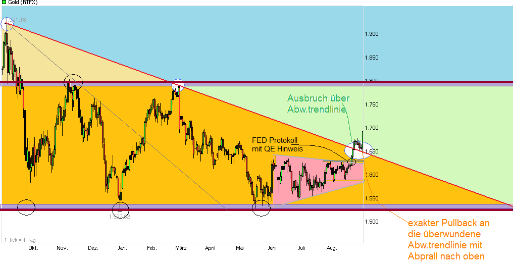 Die normale Sicht der Dinge ist aber nunmal Hochpunkte von Candlesticks mit einer Linie an den Tops zu verbinden. Und ich sehe auch kein "Fehlausbruch" in diesem Frühjahr, sondern lediglich eine Retest des Tops von Nov.2011, um so eine potenzielle Rangeoberkante einer ausgedehnten Seitwärtszone zu definieren. Da es im Frühjahr kein QE3 gab an dieser Crunch Marke, hatte man keinen Treibstoff gehabt, um aus dieser Range nach oben rauszulaufen. Wenn dir das Standartvorgehen nicht gefällt, dann mach es eben auf die Art mit dem Chart den du reingestellt hast. Wenn du damit deine Erfolge hast, dann paßt eben diese Art der CT zu deinem Typ. Muß jeder seine individuelle Art entwickelt mit der er am Besten klarkommt. Mit meiner Art bin ich jedenfalls sehr gut gefahren über die vielen Jahre und meine Trefferquote gibt mir kein Grund davon abzuweichen. Mit dem Chart den du reingestellt hast kann ich halt nicht viel anfangen, weil diese von dir gemalten rote Trendlinie an - aus meiner Sicht - vollkommen falschen Punkten angelegt ist die so keinen Sinn machen, um damit eine Abw.trendlinie zu definieren. Ist doch nicht sinnig sämtliche Hochpunkte (besonders das Allzeithoch) völlig zu ignorieren und dann mit so einer Linie sich jetzt hinzustellen und zu sagen schon vor Wochen wäre der Abw.trend geknackt worden. Im übrigen sollte man auch die Abw.trendlinie des rosa Keils bzw. Dreiecks nicht vergessen, aus dem man nach oben ausgebrochen ist nach der Verkündung des FED Protokolls. Das war der eigentliche Wink mit dem Zaunpfahl für die Gold-Bullen. Das man jetzt in einem zweiten Schritt bald danach die 200 Taglinie überwindet und den Abw.trend überspringt, der seit dem Top bei ca. 1920 fiel, und dann nochmal anschließend die letzten Tage ein Kissback machte an diese rote Abw.trendlinie, um dann wieder nach oben zu drehen sobald der QE Hoffnungsschimmer in Jackson Hole neue Nahrung gekommt, daß war dann nurnoch die Konsequenz daraus. Also die von dir gezeichnete Linie hätte mir jüngst nicht groß geholfen, um damit die exakten Ausbruch- und Pullbackpunkte zu zeigen die ich für den Kauf meiner Erstposi und den Nachkauf gestern benötigt habe. Da finde ich meine Trendlinien klarer als Signalgeber. Von daher bleibe ich lieber bei meiner Art von Linien. Warum soll ich mich gegen die Methode stellen die von der überwältigenden Masse der Marktteilnehmer und auch von Computerprogrammen so genutzt wird? Nach dieses Methode war der Ausbruch über die große Abw.trendlinie NICHT schon Wochen vorher, wie du schreibst. Letztendlich finde ich sollte man sich möglichst nach den Kriterien richten die auch Mehrheit der Marktteilnehmer als Entscheidungsgröße heranzieht. Das ist die Art wie auch ich die Abw.trendline zeichne. Der Goldpreis steckt weiter in einer großen Range von ca. 1790/1800 bis 1520/30 fest. Ich sehe übrigens das Top von März12 nicht als "Fehlausbruch", sondern lediglich als antesten der Oberseite der Range, so wie auch die Unterseite der Range in den letzten Monaten mehrfach angetestet wurde. Die globale Geldpolitik hat bislang die Spanne dieser Range eingeengt. Wie weit es jetzt wieder nach oben geht wird, daß dürfte in den kommenden Septemberwochen durch politische Events entschieden werden. Ob es genug weitere neue Liquidität geben wird, um damit dann doch wieder durch die 1800$ dynamisch mal zu laufen, kann zum jetzigen Zeitpunkt keiner wirklich sagen. Von daher kann jeder gerne jetzt KZ von 2000$ oder mehr schon voreilig raushauen, aber man sollte das Fell des Bären erst verteilen, wenn er erlegt ist bzw. wenn man die wirklichen Maßnahmen von FED und EZB kennt. Man kann zwar potenzielle nächsthöhere Widerstände für die kurze Frist benennen, aber letztendlich steht und fällt alles mit dem was die FED am 12/13.9. macht, was das Urteil zum ESM am 12.9 ergibt und was Draghi dann im Anschluß an das Urteil für Maßnahmen in welchem Ausmaß mit der EZB in Gang setzt. Bis dahin spielt die Erwartungshaltung die Hauptrolle (siehe z.B. Reaktion gestern anch 16:00). Kann gut sein, man läuft in den kommenden Monaten wieder bis mindestens 1790/1800 hoch, wenn die Geldfluten von FED + EZB kommen. Sollte die FED ihre Maßnahmen verschieben bis nach der US-Wahl oder sogar ganz unterlassen und Karlsruhe den ESM Klägern Recht geben, dann kann man 1800$+x beim Gold erstmal für eine Weile wieder vergessen. Ist also eine nicht unriskante Wette, die eine wachsende Rückschlagsgefahr in sich birgt je mehr an Hoffnung schon von den Terminen Mitte September in den Goldkurs eingepreist wird. Von daher sollte man sein SL dynamisch jetzt nachziehen, um nicht mal auf dem falschen Fuß erwischt zu werden. Mein angedachtes momentanes Tradingsziel bleibt erstmal die Region um die 1725/30. Wäre ca. eine 100% Ausdehung nach oben der alten Spanne 1525/30 - 1625/30. Spatzen/Tauben, Hände/Dächer :) Den SL ziehe ich stetig dynamisch nach, momentan bei knapp unter dem Low von gestern. Sollte es neue Fakten/Entwicklungen geben die mich vermuten lassen es geht von 1725 weiter bis wenigsten 1790/1800, dann kann es gut sein ich würde nach einem Verkauf bei 1725/30 doch erneut nochmal einsteigen bzw. der angedachten Verkauf verschiebe und einfach stattdessen den SL nahe unter 1725 legen. Wünsche ein schönes Wochenende allerseits.