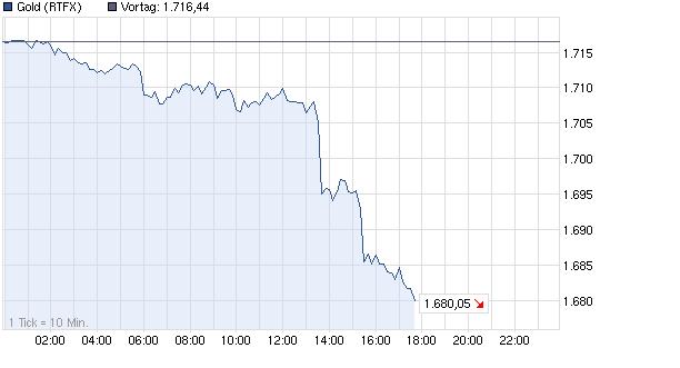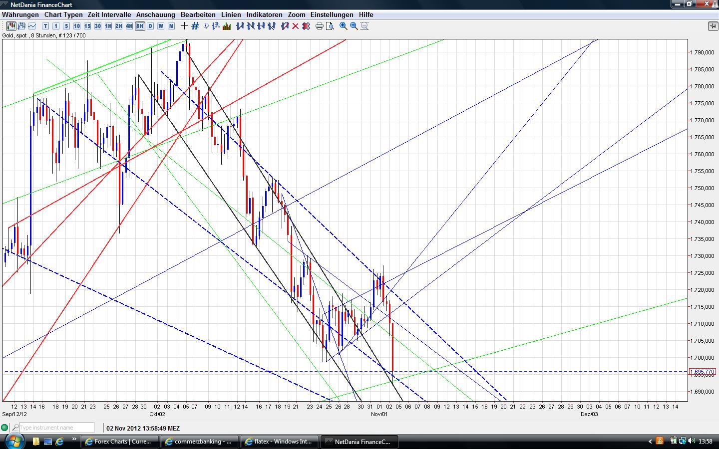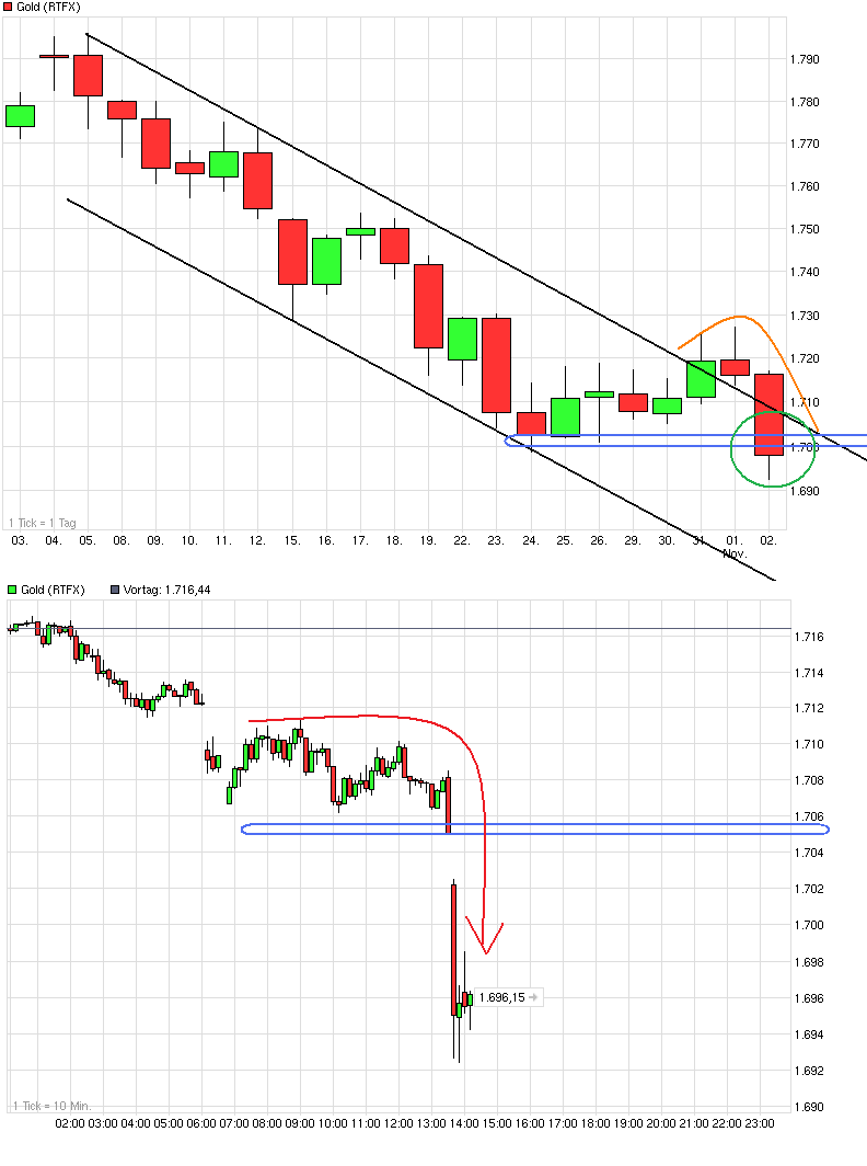 Da hast du deine für heute gewünschten 1680$. Wird jetzt bei dir Kasse gemacht? Wenn ja, dann erstmal Gratulation :) Der Kurs überrascht mich nicht so sehr nach dem Break der 1698/1700, nur das Tempo ist doch etwas fixer als ich dachte. Hätte das eher im Laufe der kommender Woche erwartet. Aber es waren offenbar zu viele zu fett auf der Long Seite die nun auf dem falschen Fuß erwischt werden und sich gegenseitig über den Haufen rennen. => ( http://www.godmode-trader.de/nachricht/Gold-Haendler-bullisch-wie-seit-10-Wochen-nicht-mehr,a2955667.html => "..Gold: Händler bullisch wie seit 10 Wochen nicht mehr...Freitag 02.11.2012. Die von Bloomberg befragten Analysten und Händler sind für den Goldmarkt derzeit anhaltend bullisch gestimmt. Die meisten Experten betonten die hohe Nachfrage nach den ETFs sowie die expansive Geldpolitik der führenden Notenbanken und rechnen daher in der nächsten Woche mit einem Anstieg der Kurse. Verluste erwarten nur wenige Experten.... Die Bullenquote liegt somit bei fast 67 Prozent. Zum Bärenlager gehören nur 18 Prozent der Experten....Die von Bloomberg erfassten Gold-ETFs haben am Donnerstag ein neues Allzeithoch beim Bestand erklommen. Der Bestand erreichte 2.588,4 metrische Tonnen, was in etwa der kompletten Jahresminenproduktion entspricht. Alleine seit Ende Juli 2012 hat der Bestand um rund 10 Prozent zugelegt....). Von daher mal schauen, wann es nun wieder genug Leute gibt die wieder bärisch eingestellt sind, damit die Luft wieder sauberer ist für den nächsten Anstieg. Zuviele Bullen ist einfach Gift für die Long Seite. Vielleicht muß es sogar erst noch bis zum 50% Retracement weiter runtergehen. Time will tell....