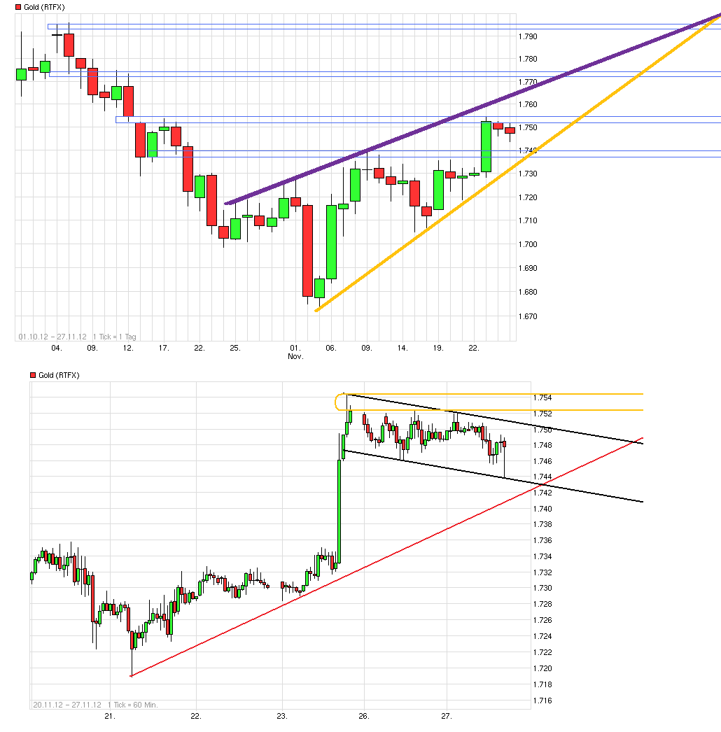 New York (BoerseGo.de) - Der Preis für die Feinunze Gold fällt um 1,80 Dollar und notiert zum Handelsschluss bei 1.749,60 Dollar. Händler führen das Minus für das Edelmetall auf den etwas stärkeren US-Dollar zurück. Das Intraday-Tief lag bei 1.746,90 Dollar. Auch hier richten Händler ihr Augenmerk auf die Geschehnisse in Brüssel, wo die Euro-Finanzminister erneut über das große Sorgenkind Griechenland beraten. Bei den Debatten geht es darum, die erneut aus dem Ruder gelaufene Staatsverschuldung Athens unter Kontrolle zu bringen, damit die ausstehenden Hilfskredite ausgehändigt werden können. Auch die morgen zur Veröffentlichung anstehenden Daten zum US-Verbrauchervertrauen werden mit großer Spannung erwartet. Am Donnerstag kommen dann die Zahlen zum US-Bruttoinlandsprodukt, die von hoher Bedeutung sind. "Die beiden Daten werden zeigen, ob das bei den Anlegern als sicherer Hafen beliebte Gold kurzfristig gefragt sein wird, um sich gegen einen schwächelnden US-Dollar und eine mögliche Rezession in den USA Anfang 2013 abzusichern", so Rohstoffexperte Jeffrey Wright von Global Hunter Securities
