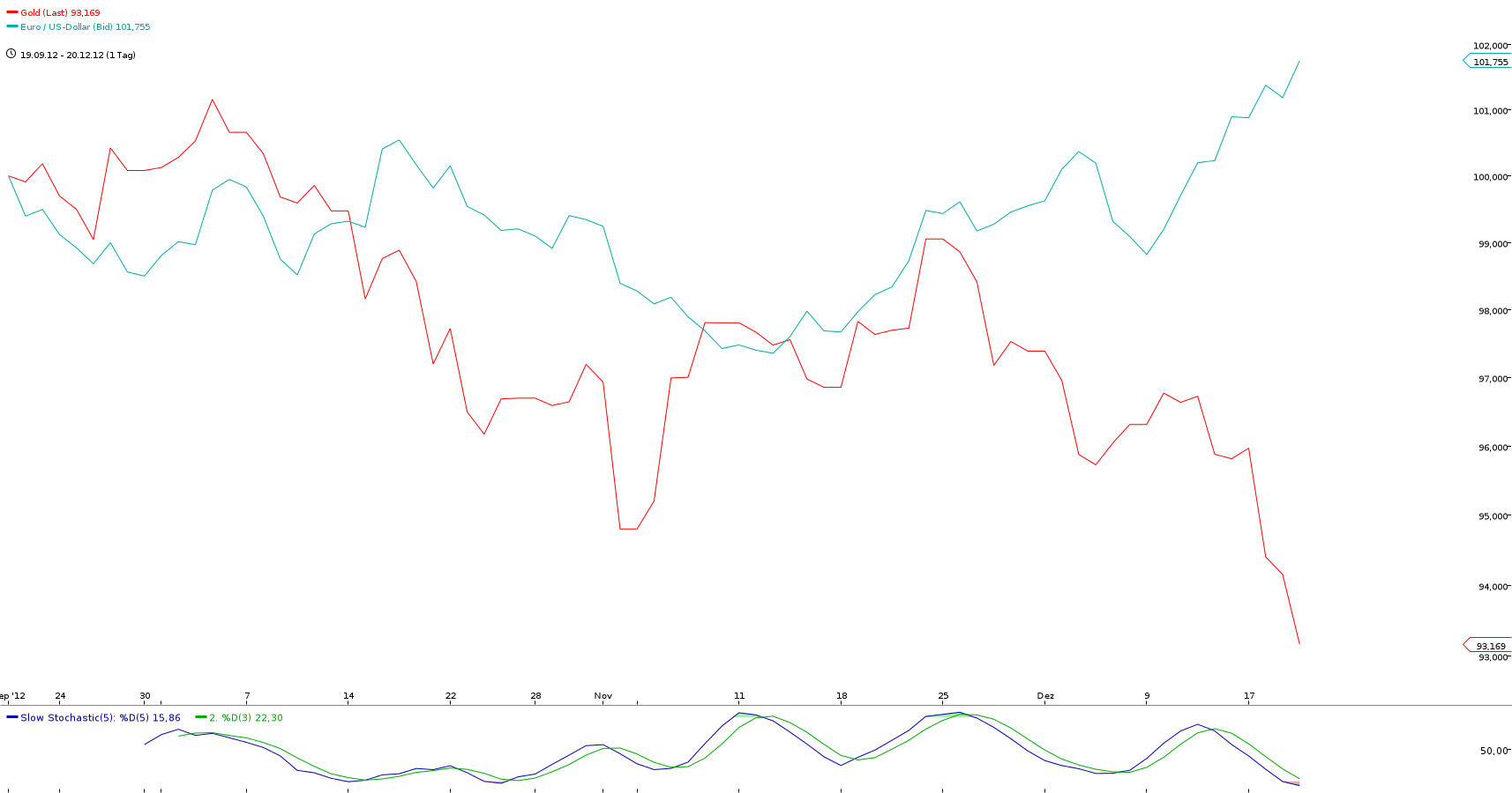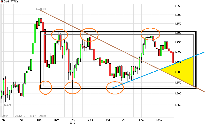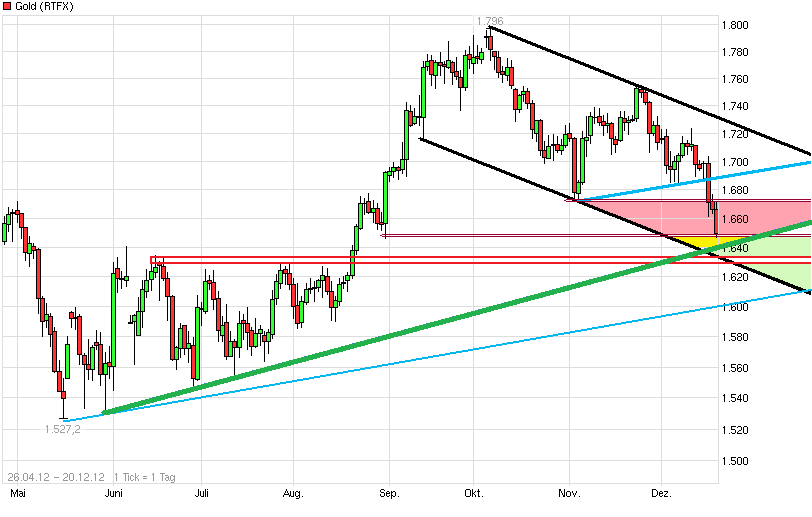 Also wenn die horizontale Unterstützung bei ca. 1646 nicht halten sollte (was gut sein kann), dann kann es durchaus in den von dir angesprochenen 163x $ Bereich gehen, d.h. bis zur unteren schwarzen Begrenzungslinie des seit Anfang Oktober fallenden Abw.trendkanals. Allerdings müßte man vorher auch noch den grünen Aufw.trend killen der seit Anfang Juni steigt. Alles keine Dinge die man nicht unbedingt an einem Tag erledigt. Die 200er wurde auch nicht im ersten Anlauf gekillt. Vielleicht reicht für heute also erstmal das Low bei 1646. Solange man jetzt aber unter der 200 Tagelinie notiert ist natürlich der Bär in Feierlaune. Es kann also auch nur maximal eine Pullback geben bis zur 200er und dann wieder Südkurs aufgenommen werden. Generell sind natürlich nach unten auch noch tiefere Kursstände denkbar wie z.B. roundabout 1600$. Aber ich denkte die oben genannten Marken sollten in der näheren Zeitbetrachtung erstmal die relevanten bleiben. Der große Anstieg dieses Jahres ging ja Mitte August los als man über die 1630 hochschoß, weil man eben von der FED damals Signale für ein weiteres QE bekam und auch Draghi die Euro-Geldpresse ins Spiel brachte. Somit hat man bald diesen ganzen Anstieg seitdem wieder wegkorregiert. Hätten viele Leute sicher nicht erwartet, daß es jetzt gegen Ende 2012 solche Kurse nochmal geben wird. Na, dann dürfen wird ja mal gespannt sein welche Kapriolen man 2013 sehen wird beim Gold mit dem heute noch keiner so rechnet ;) Was auf jeden Fall wieder erkennbar war, daß ist wenn zuviele Leute sich zu sicher sind auf der Bullenseite und die "Experten" sich übertrumpfen mit KZ von 2000+x Dollar, dann kommt gerne das Gegenteil und die Leute mit Schieflage ziehen dann alles zügig wieder in den Keller. Ist die Frage, ob jetzt schon wieder genug Leute negativ gestimmt sind für Gold oder ob man noch brutaler korregieren muß damit die Luft wieder rein ist zum etwas längeren Long gehen.