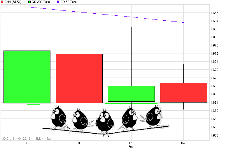 Weiterhin entscheidungsunfreudig das Teil. Aus dem schwarzen Abw.trendkanal will man bislang genauso wenig raus wie aus der großen Seitwärtsrange von roundabout 1670 +/- 25$ .Die letzten 3 Tage konnte man sich beim SK über 1660/62 behaupten (d.h. im Bereich der SMA200). Heute ist bislang wieder Druck auf dem Wert und bei einem Break durch die 1660 wäre der seit Anfang Januar steigende kurzfristige Aufw.trend hinüber. Daher mal schauen, ob größere Hände bereit sind heute Nachmittag das Teil wieder hochzuhalten. Bei einem Break würde sich das Fenster weiter öffnen Richtung Seitwärtsrangeunterkante, d.h. Kurse im Bereich 1645/50. Bei einem SK unter 1646/47 sähe es ziemlich düster aus. Dann wäre wieder die Unterkante des schwarzen Abw.trendkanals im Fokus, Das ist mir alles aktuell weiter zu wenig impulsiv was hier passiert. Ich brauch mal SK Kurse über 1700 oder unter 1645. Daher warte ich erstmal weiter auf eine gewisse Richtungsentscheidung.