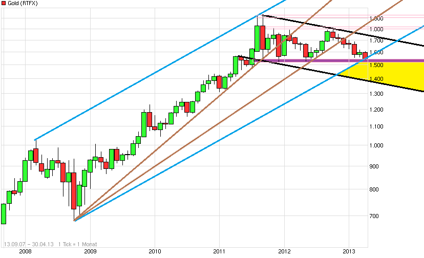 Der Goldpreis ist am Donnerstag im Zuge einer allgemeinen Preisschwäche bei Rohstoffen auf den tiefsten Stand seit fast einem Jahr gerutscht. Nun droht dem goldenen Edelmetall ein so genannter Bärenmarkt. Im Vormittagshandel verlor der Preis für eine Feinunze (etwa 31 Gramm) 10,40 US-Dollar auf 1.546,95 Dollar. Zuvor hatte er bei 1.540,90 Dollar den tiefsten Stand seit Ende Mai 2012 erreicht. Experten der Commerzbank sprechen von einem "allgemeinen Abwärtssog bei Rohstoffen". Zudem habe es zuletzt "kräftige Abflüsse" bei Gold-Indexfonds (ETF's) gegeben. Seit dem Rekordschlusstand im September 2011 bei 1900,23 Dollar hat der Goldpreis etwa 18,7 Prozent verloren. Damit nähert sich der Preis der Feinunze einem Rückgang von 20 Prozent an, der den Beginn eines Bärenmarkts definiert. Von 2001 bis 2012 hatte der Goldpreis in jedem Jahr kontinuierlich zugelegt. Die Commerzbank-Experten rechnen kurzfristig mit einem weiteren Preisrückgang, nachdem der Goldpreis zuletzt wichtige charttechnische Unterstützungslinien nach unten durchbrochen habe. Ausserdem lastet nach Einschätzung von Händlern eine Analyse der französischen Grossbank Societe Generale vom Beginn der Woche auf dem Goldpreis. Am Markt habe sich laut Societe Generale eine "Blase" gebildet. Nachdem der Preis für das gelbe Edelmetall zwölf Jahre in Folge gestiegen sei, dürfte die Rally nun einem "Bärenmarkt" weichen. "Wir sehen, dass viele Menschen aus mit Gold hinterlegten börsennotierten Fonds in andere Investments umschichten", sagte Jonathan Barratt, Chef des Rohstoffblatts Barratt’s Bulletin in Syndey, in einem Interview mit Bloomberg TV. Die Anleger "gehen aus Gold raus und in Aktien rein, weil sie sehen, dass die Inflation kein Problem darstellt und der US-Dollar stark ist." ....."