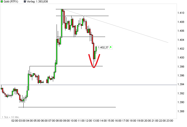 So, nachdem jetzt auch langsam Uncle Sam aus dem Bett gekrochen ist, hat sich damit der wichtigste Marktteilnehmer auch hinzugetrollt zu uns Zwergen aus Europa. Und schwupppssss... haben offenbar die Bären mal wieder ihren täglichen "Hammer-Mann" losgeschickt, um nachhaltige Kurse über 1400 zu verhindern. Kurs eben kurz bei 1398. Allerdings hat man sich schon wieder über die 1400 zurückgemogelt. Also ganz so kampflos geht es scheinbar dann doch jetzt nicht unter 1400 zurück. Mal abwarten was die US-Konjunkturdaten um 14:30 hergeben und ob es vielleicht jetzt nur ein Pullback an die Oberseite der Seitwärtsrange der letzten Tage war. Die letzten Wochen haben sich viele Hedgefonds short neu positioniert. Ist natürlich die Frage, ob die es konzertiert schaffen jegliche Bewegungen immer sofort intraday abzuwürgen oder ob die etwas Luft nach oben nochmal zulassen ( http://www.ariva.de/news/...onds-sehen-beim-Goldpreis-schwarz-4543047 => Hedgefonds sind beim Goldpreis derzeit so wenig optimistisch wie seit über fünf Jahren nicht mehr. .. Der Bestand an Short-Kontrakten kletterte um 6,7 Prozent auf einen Rekordstand von 79.416. )