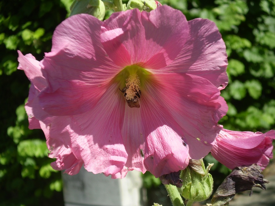 Ja, genau, das ist eine Malve. Auch bekannt unter Stockrose, Bauernrose, Stockmalve ... Im Gegensatz zu Rosen ist sie für "Cetonia aurata", den "Goldglänzenden Rosenkäfer", als Futter uninteressant, denk' ich mal ;-)
