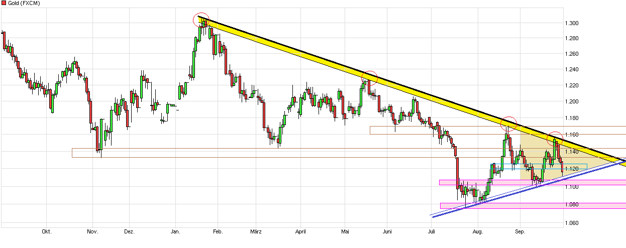 (hoffentlich) näher kommen. Hatte die letzten Tage mich auch dem Gold traden erstmal wieder rausgehalten und habe dafür mehr das süße Gold ( = Zucker) long getradet. Eigentlich ist alles unverändert beim Gold, sprich es gibt keinen wirklichen zwingenden Grund große Goldanstiege zu erwarten, außer Euro/Dollar würde wieder weiter steigen. Das ist auch ein Punkt der die Sache beim Gold zunehmen schwieriger macht, da Euro/Dollar nun schon länger irgendwo zwischen 1,11 und 1,13 rumeiert und man sich nicht entscheiden kann, ob man mal weiterzieht Richtung 1,20 oder Richtung Parität. Sollte man sich weiter darauf einstimmen, daß die FED im Dezember dann doch die Zinsen anhebt, dann würde es weniger wahrscheinlich sein, daß Euro/Dollar wirklich größer anzieht, zumal Draghi auch immer wieder verbal damit "droht" das QE vielleicht auszudehnen, was den Euro weiter schwächen würde. Aber wer kann schon absehen welche neuen Ausreden die FED immer weiter finden wird den Zinsschritt immer weiter nach hinten zu verschieben. Von daher einfach erstmal auf die Technik schauen. Man läuft momentan in die Spitze eines Dreiecks bei Gold bestehend aus dem Abw.trend seit Jan.15 und dem Aufw.trend seit Juli15. Ich denke ich warte jetzt erstmal mit einer neuen Postitionierung ab bis etwas klarer wird in welche Richtung man das Dreieck verlassen möchte und hoffe, daß parallel auch Euro/Dollar mal endlich aus dem langweiligen Seitwärtsgeeiere rauskommt. Würde es klar unter 1100$ gehen, dann könnte man unterstellen, daß sich die letzten zwei Monate ein Doppeltop ausgebildet hätte. Die Bären wären nicht unglücklich.