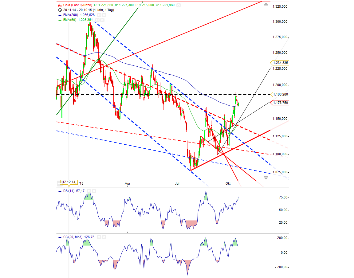 Gold is still up some 6% from where it was trading before the US Federal Reserve at its September meeting decided to hold rates steady. The dollar and gold, and bond yields and gold, have strong negative correlations and on Monday the greenback rose against the currencies of its major trading partners for an 11% gain over the past 12 months.