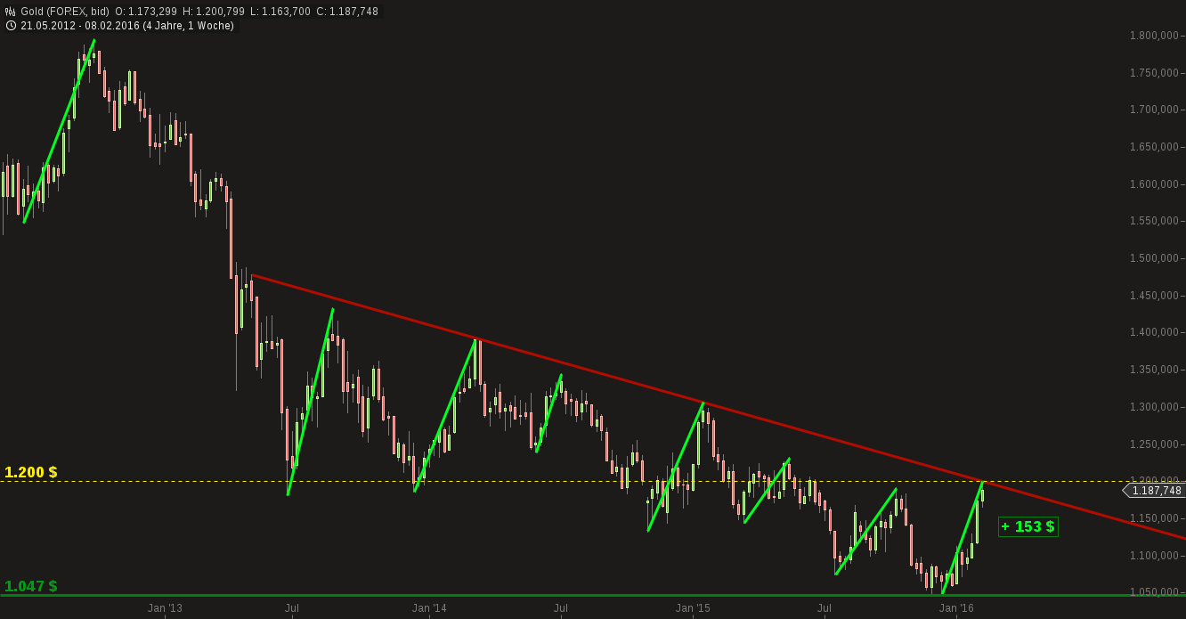 ab vom reinen Mitläufer bei der Euro/Dollarbewegung und scheint etwas zusätzlich als sicherer Hafen für manchen zu dienen, da der Aktienmarkt kurzfristig Kummer macht. Tja, da hat sich am Freitag im sehr späten US-Handel der Goldkurs doch von den schwächelnden Aktienmärkten anstecken lassen und ist dann wieder über die 1160 gerannt. Scheint aber um die 1175 jetzt erstmal nicht so locker weiterzukommen. Mal schauen, ob man nur auf die US Boys wartet. Ich hatte zwar weiter noch long als laufende Grundtendenz auf dem Radar, hatte aber mit etwas mehr Zwischenkorrektur gerechnet Richtung 1135/40, um da wieder long zu gehen. Tja, ist nicht immer also so wie man es gerne hätte ;) Man ist jetzt wieder in dem gelben Aufw.trendkanal den man im Nov.15 verlassen hatte und nimmt weiter Kurs auf obere Abw.trendlinien und höherliegende horizontale Widerstände. Da wäre z.B. die nächste Marke um die 1191/92$. Also wenn man sich weiter über 1160/65 halten wird und Dow, Dax&Co weiter die Anleger kurzfristig etwas wuschig machen sollte, dann könnten 1191$ in nächster Zeit garnicht so unwahrscheinlich sein. Habe heute eine kleine Long Posi gekauft bei 1169$. Nur eine kleine Posi, da man ja doch schon schnell & weit gelaufen ist kursfristig und daher auch das Risiko von Gewinnmitnahmen erhöht ist sobald sich der Aktienmarkt wieder etwas erholt. Aber einen kleine Wette auf ca.1190/92 sehe ich mit einem vertretbarem CRV. Allerdings relativ eng abgesichert.