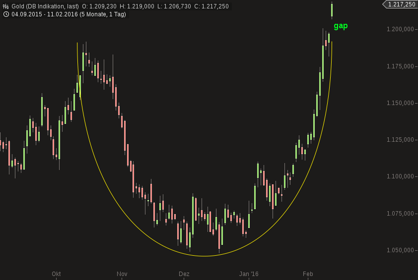 Nachdem die Cup and handle Formation den Sekundären Abwärtstrend von Oktober 2015 aufgelöst hat. wollen die Bullen nun auch den primären Abwärtstrend von April 2013, der seid drei Jahren immer wieder gesiegt hat angreifen - sehr mutig!