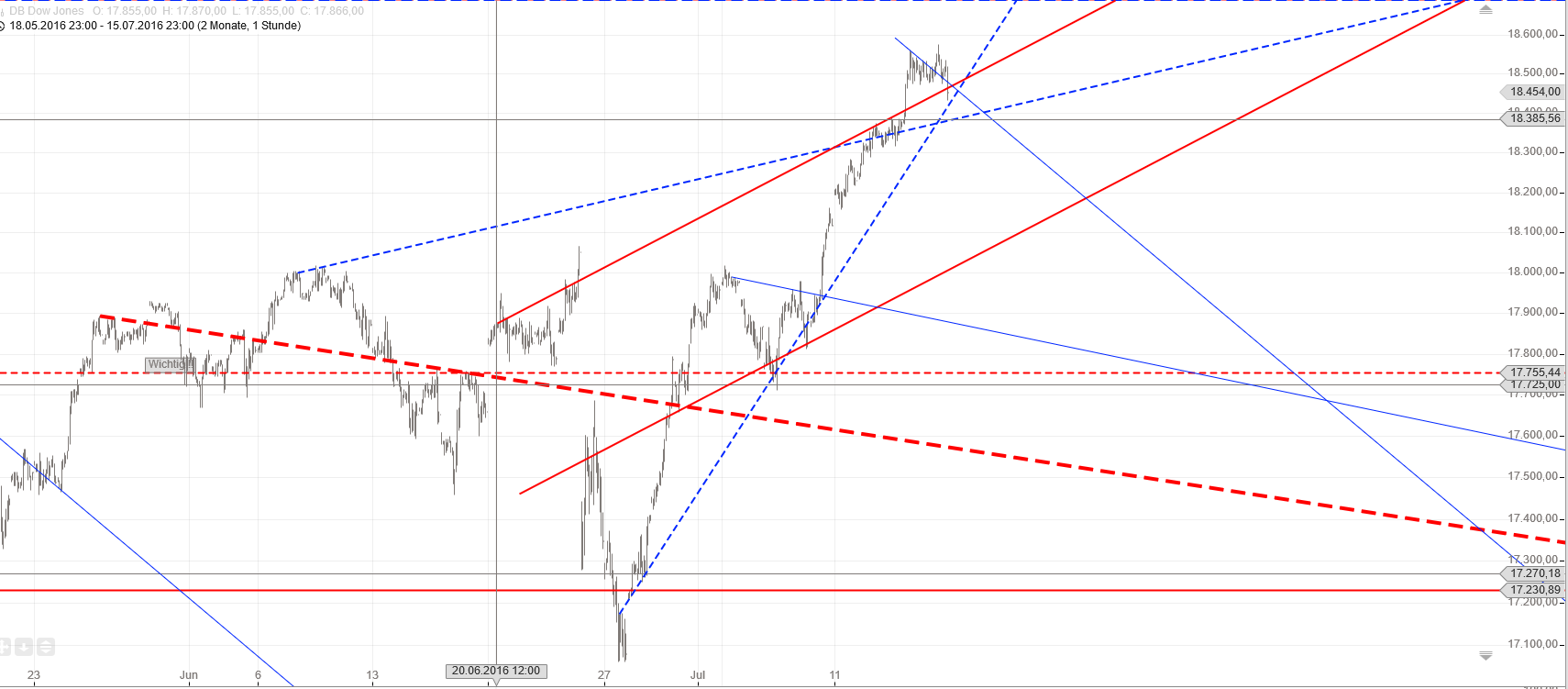 Beim Dow ist es nun wichtig, dass der Kurs unterhalb vom letzten Hoch bei 18352 schliesst, damit es weiter gen Sueden gehen kann. Wenn ich mir die Std angucke, duerfte das kein Problem sein. Am 19.07 werden wir spaetestens schlauer sein, an dem Tag habe ich etwas im Dax 4 Std Chart, was noch eventuell abgearbeitet wird.