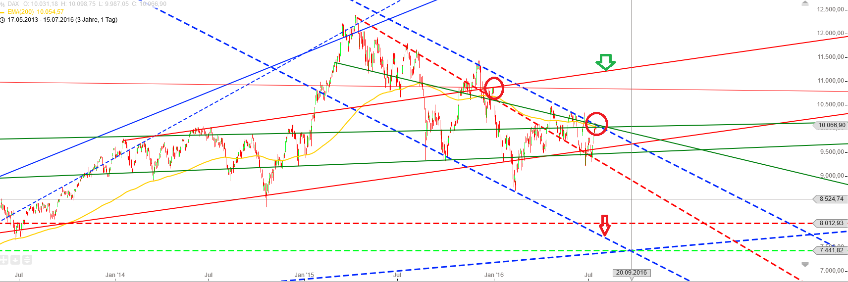 Heute verschone ich euch nicht mit den vielen Linien. Das wichtige ist jetzt aber erstmal, dass der Dow in dem Kanal zurueck ist. Beim Dax sieht das in der Std noch anders aus, aber in dem 4 Std Chart ist er ebenfalls in dem Kanal, den ich hier gezeigt habe. Verzeiht mir, dass ich das immer ein Kanal nenne, wie ich es schon bei den Dreiecken geschrieben habe, ist es kein Kanal wo sich der Kurs eine ganze Weile aufhaelt. Wichtig ist, dass die Linien abgearbeitet werden.