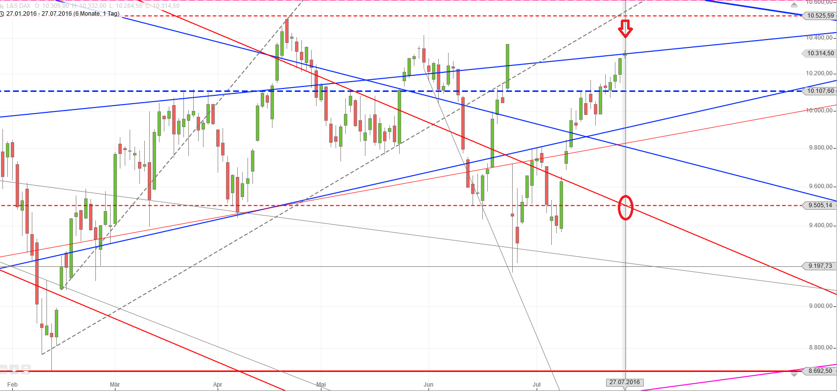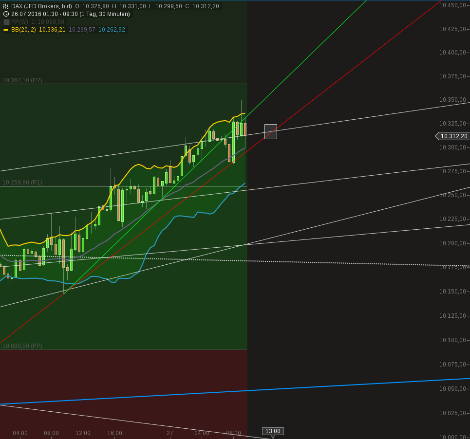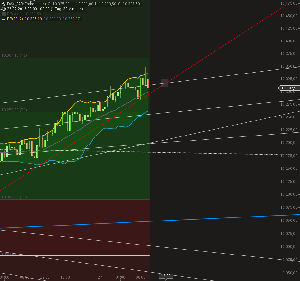 Bevor ich nun fuer eine Std weg muss, werde ich euch noch ein Chart zeigen mit den Punkten wo ich angelegt habe. Dieser Chart gilt erst ab 15:30 Uhr denkt bitte daran. ich glaube kaum, dass irgendeiner so anlegen wird, aber es ist eben mein System, wo ich am besten mit klar komme. Sollte also die gruene gestrichelte nach oben nachtraeglich verlassen werden, koennte man long gehen. Unterhalb weiter short.