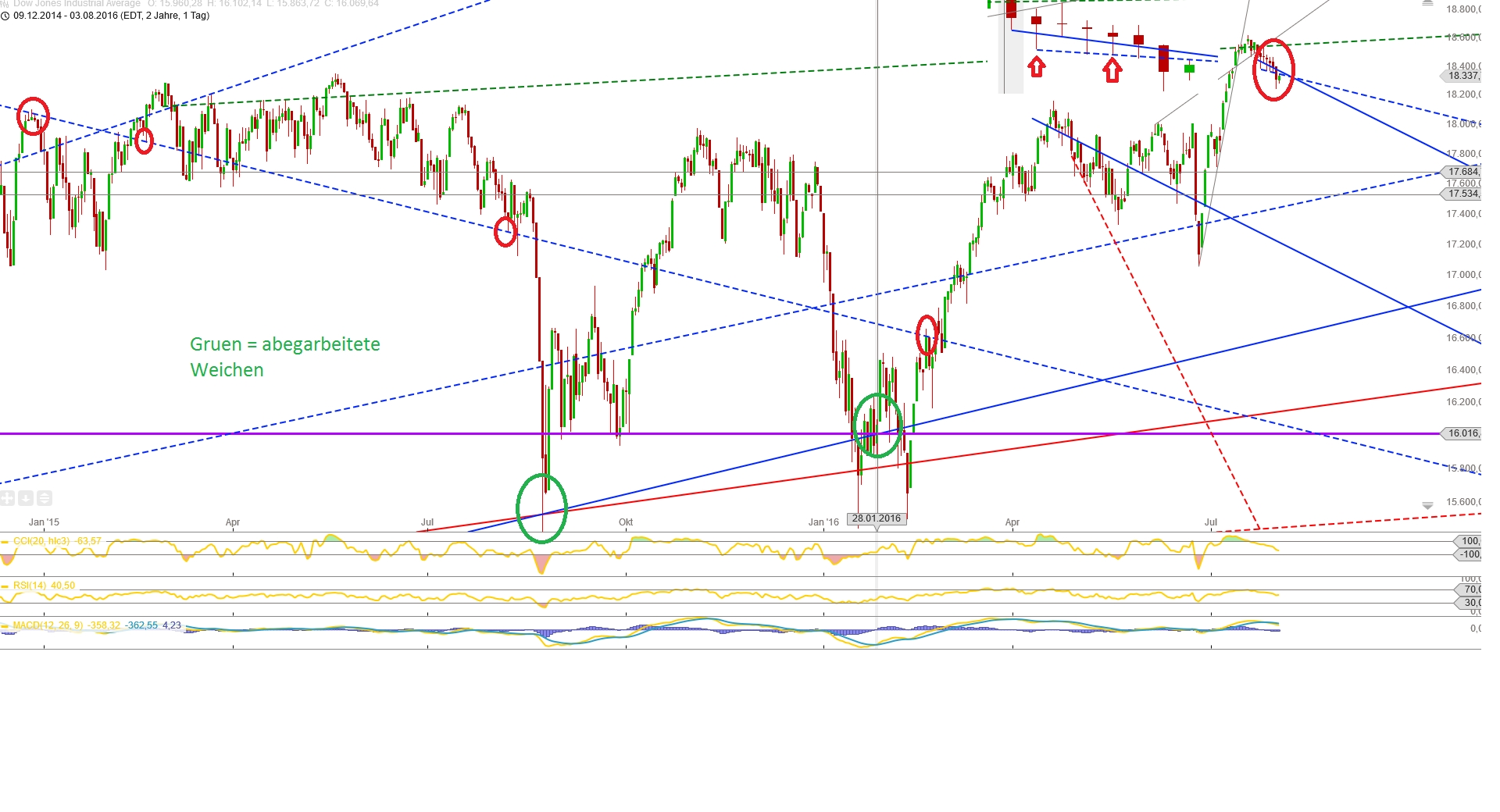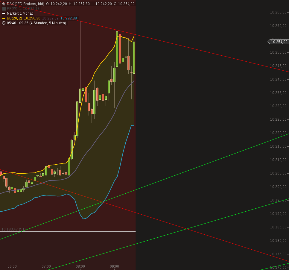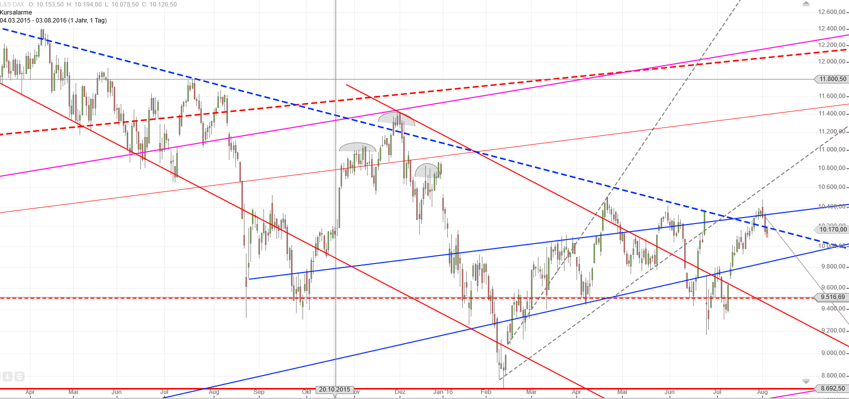 Wie ich es schon agedeutet habe, wurde die gezeigte Linie bereits 2 x ueberschossen. Das ist aber bis jetzt nicht tragisch. Um nicht in Panik zu verfallen, gucke ich mir immer dabei den Dax an. Im L&S Daily hat der Kurs nicht die obere Trendlinie erneut gebrochen, so das ich noch ganz ruhig bleiben kann.
