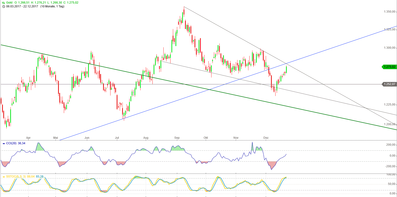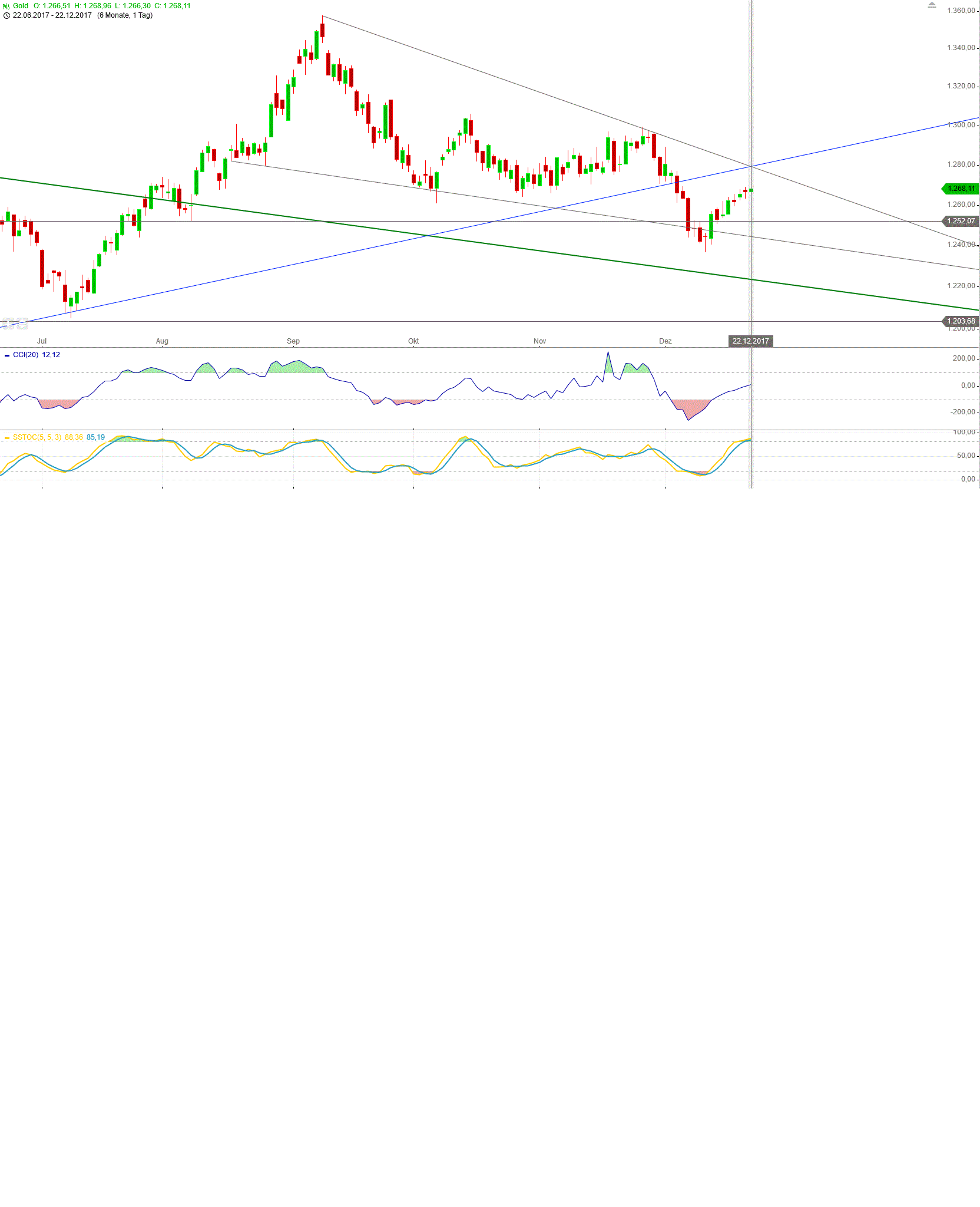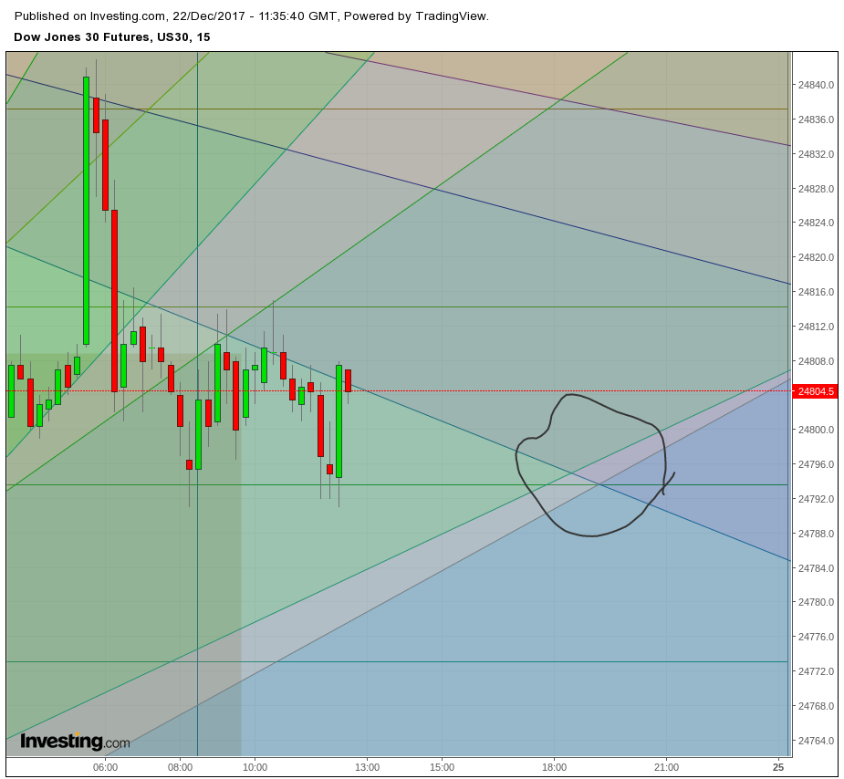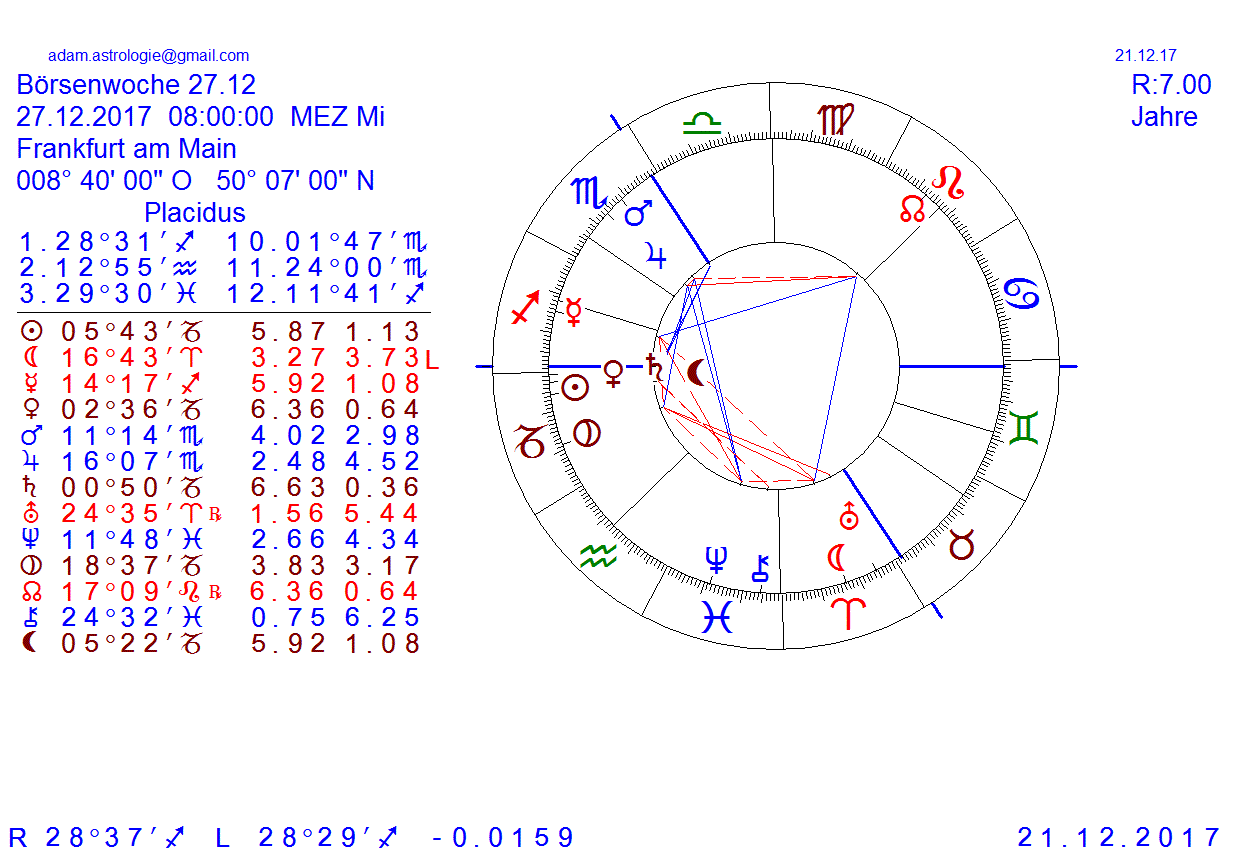 diese woche haben wir ganz andere voraussetzungen, da wir am Mittwoch eröffnen, haben wir den MO im kardinalen Zeichen Wid und auch der ME ist wieder geradeläufig, das könnte wie eine Zündung wirken, der ME wirkt wie ein Pfeil im Bogen der rückläufig angespannt wurde und jetzt losgeschossen, daher rechne ich mit einer Jahresendrallye, ich sag mal so, diesen ME steht nichts im Wege, es sei denn, die Pla im Stbk wirken wie eine Bremse, jedoch denke ich dass sich das erst im Jänner auswirken wird, wenn sich dann bei Neumond der MO und ME dazugesellt, könnte ein Trendwechsel nach unten vollzogen werden, wir wissen ja lt den Daten von Spgre, dass bei Hochs aber auch Tiefs eine 70% Planetenansammlung in einem Zeichen festzustellen war,bei soviel Pla im Zeichen Stbk könnten wir dann die Decke erreicht haben für längere Zeit, aber mehr dazu im Jahresradix 2018 welches auch zugleich das Jännerradix ist.