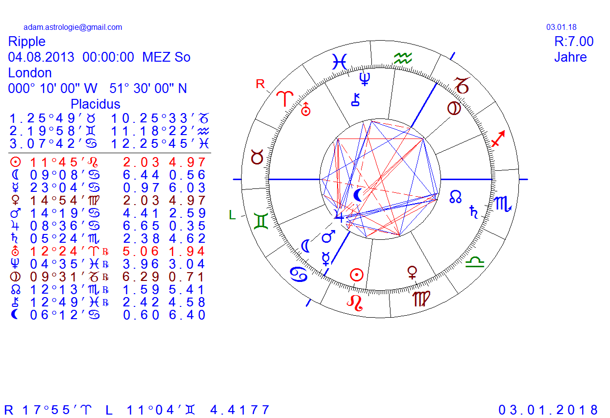 wie ihr bei den anderen Kryptos noch sehen werdet haben viele den JU im Kre, was jetzt beflügelt, auch haben wir hier ein schönes NE zu SA Trig sowie zu MO der mit JU im Krebs erhöht ist, also als Volkswährung beliebt ist bzw. es noch wird, im Gegensatz zu Bitcoin der im Stbk einen anderen Machtfaktor entspricht, ein Kriterium wird sein wenn den nächsten Jahre all die Steinb Pla wie SA/PL und JU in Opp auf die Pla im Kre einwirken, meineserachten wird es dann eine Trennung des Weizen von der Spreu geben, heisst nicht alle Coins werden durchhalten, auch wenns für den Ripple mitunter dann schlecht ausieht, er hat ein radix wie ein Stehaufmännchen, denn er hat die Qualität einer guten Verwurzelung, im Gegensatz zum Bitcoin als Widersacher, bei dem die Machtfaktoren von oben herab überwiegen, von der Kapitalisierung am 2.Platz bereits, erscheint mir der Ripple unterbewertet, da könnte man schon einige wenige hundert Euro riskieren für eine Kursverzehnfachung!