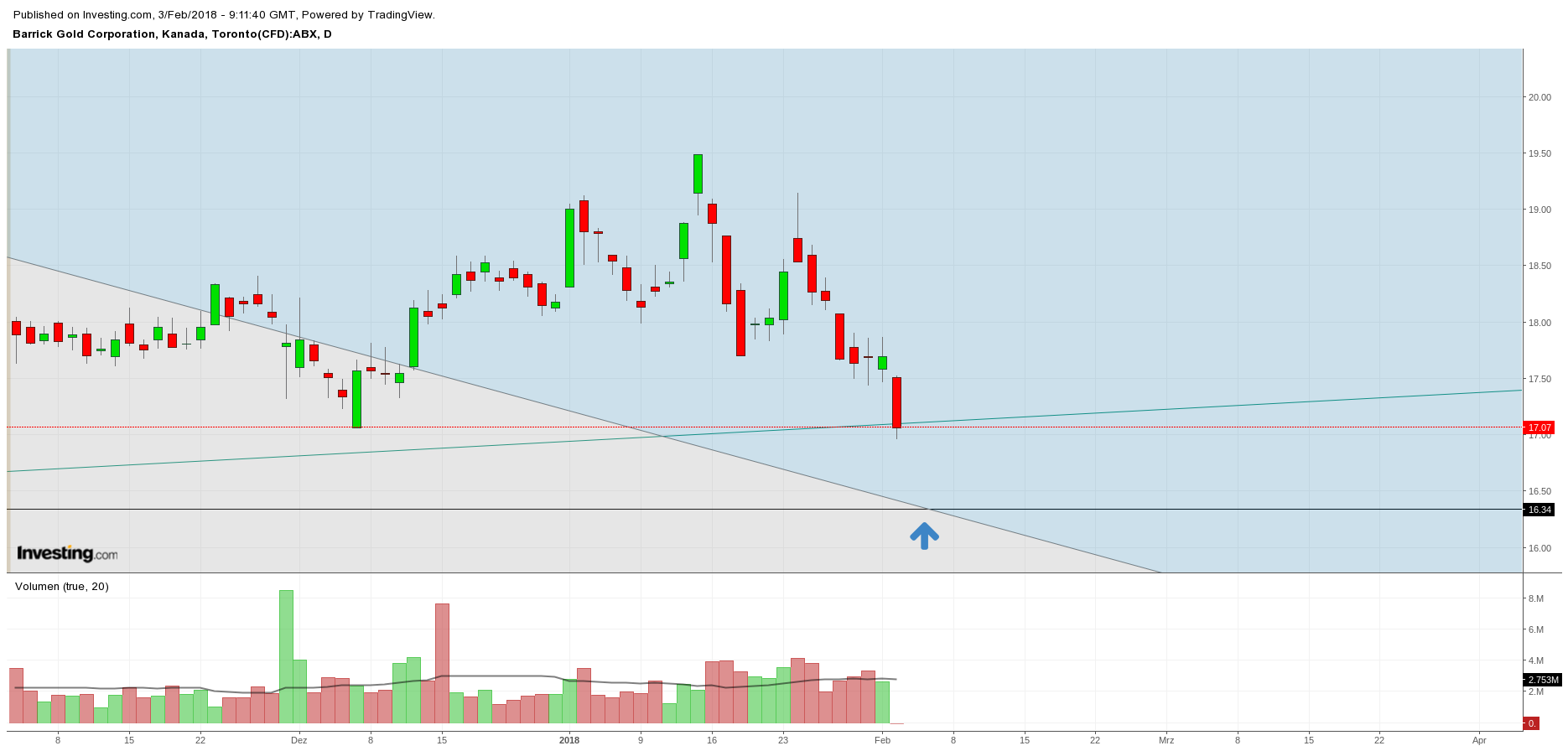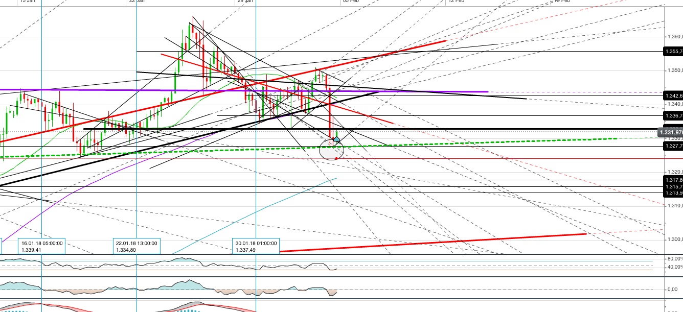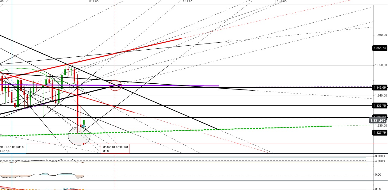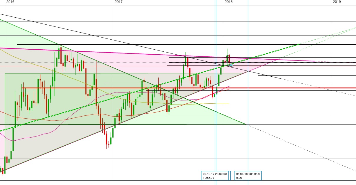 Oberhalb hat der Chart noch eine grün/rote Weiche die noch nicht abgearbeitet ist. Ich hatte bereits geschrieben, dass ich damit rechne, das der Kurs diese Weiche noch abarbeiten wird. Am ca 18.02.2018 habe ich unterhalb die erste Weiche. Das könnte bedeuten, dass ab diesen Datum der Kurs wieder fallen wird. Jetzt ist der Kurs an der Trendlinie das zweitemal abgeprallt. Nun müssen wir genau beobachten was weiter passiert. Wenn man nun schon short gehen möchte, würde ich an dieser blauen Trendlinie einen Stopp setzen. Setzt der Kurs auf der Trendlinie eine Kerze, passiert das wahrscheinlich, was ich oben beschrieben habe...
