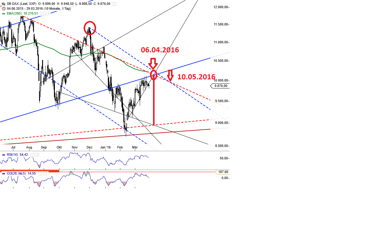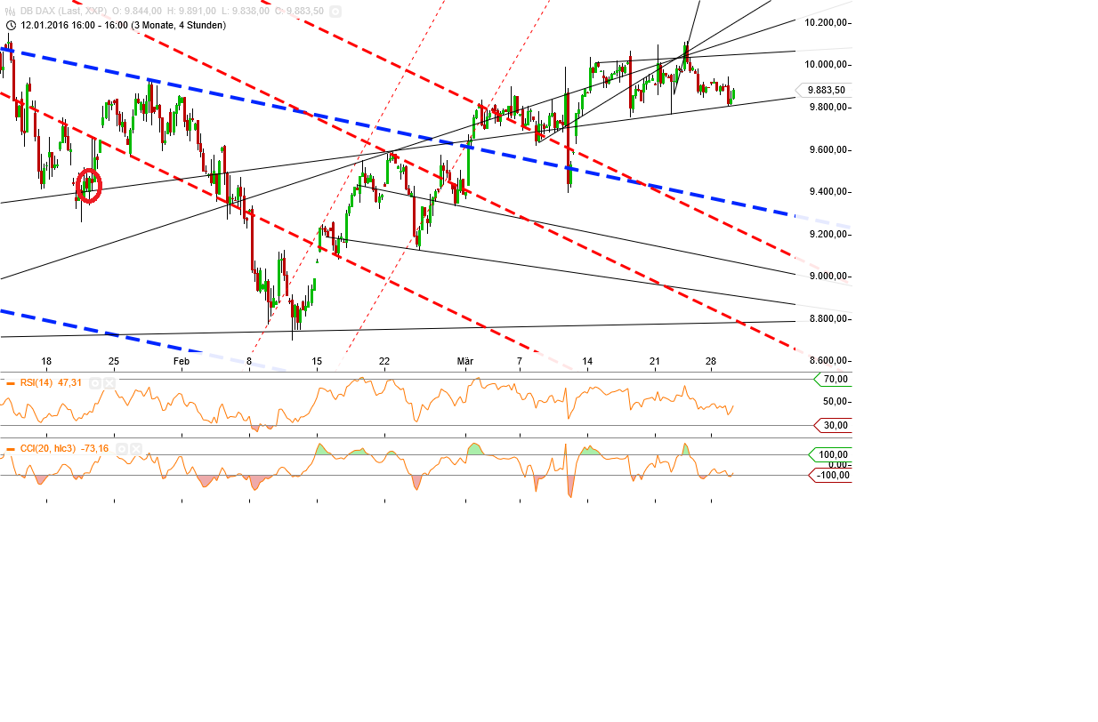Wichtige Punkte mit Datum beschriftet. Die frage ist nur, geht der Dax bis zum 06.04 seitlich oder fällt der Dax bald und hat dann sein tiefsten Punkt unter diesem wichtigen Schnittpunkt..Denkt an den 4Std Chart. dicke blaue ist der untere Rand vom langjärigen Trend.