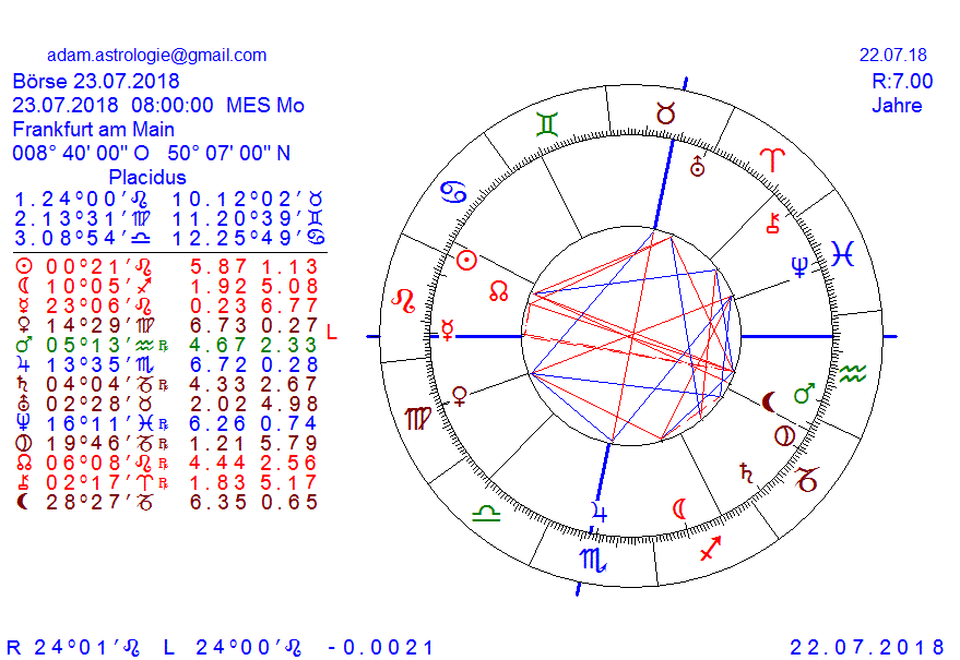 die Woche wird geprägt von 2 Opp, Dienstag VE zu NE und Freitag SO zu MA, wobei die Zweite die Schwierigere ist, da hier zwei Grundhaltungen aufeinander prallen, die auf gegenseitiges Unverständnis stossen, mein einigt sich nicht sondern dividiert sich auseinander, es werden geopolitische Machtkämpfe hinter unseren Rücken ausgetragen, bzw auf unsere Kosten und unserer Zukunft, verstärkt durch das SO Quadr zu UR am Mittwoch, es sind zu unterschiedliche Weltbilder die aufeinander treffen, auch ein Wirtschaftskrieg ist ein Krieg und die Grundstimmung wird die Börse bestimmt beeinflussen besonders am Freitag haben wir nur neg,Aspekte